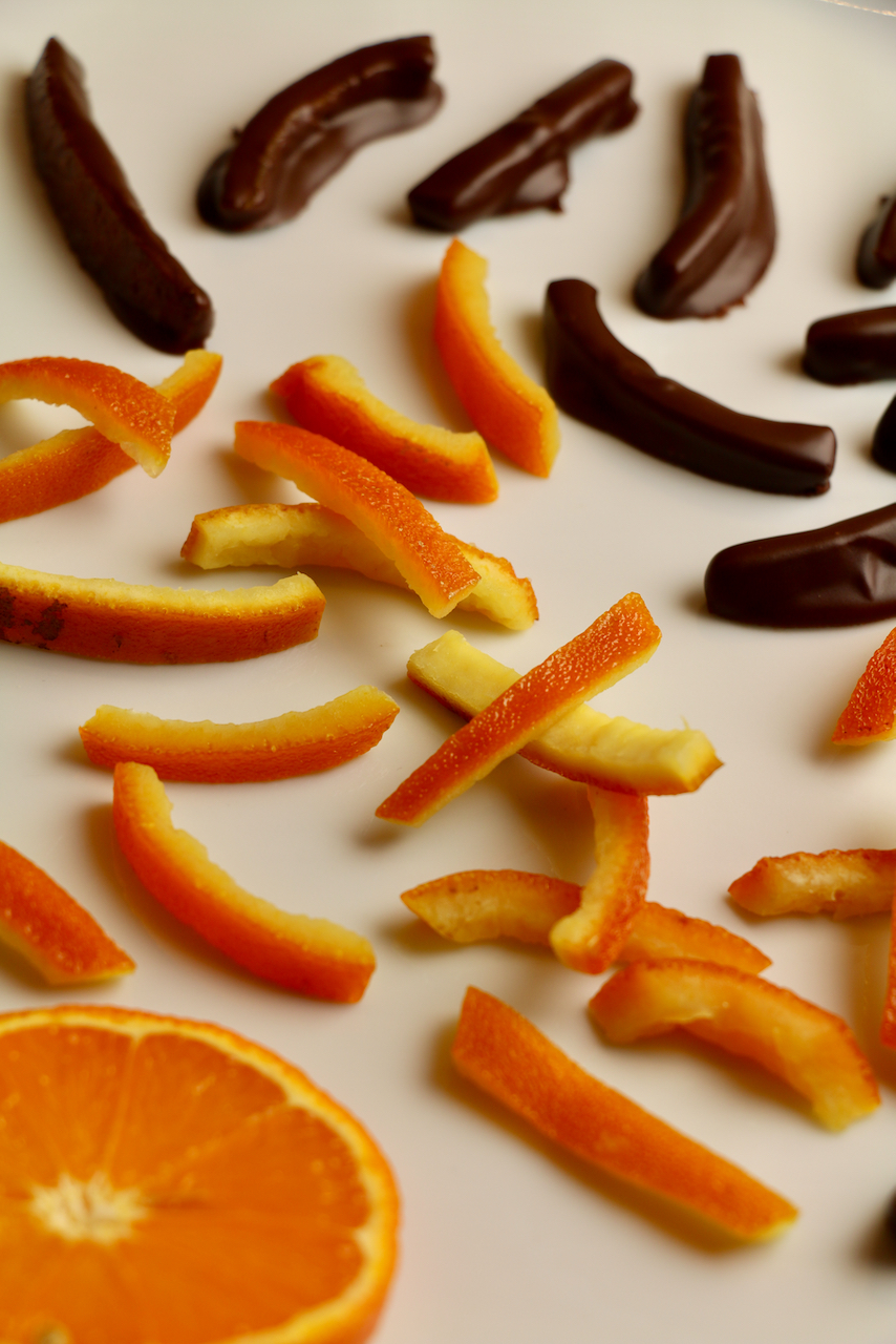 Kandierte Orangenspalten schmecken so schon genial. Und dann erst noch in dunkle Schokolade getunkt… ein Traum.