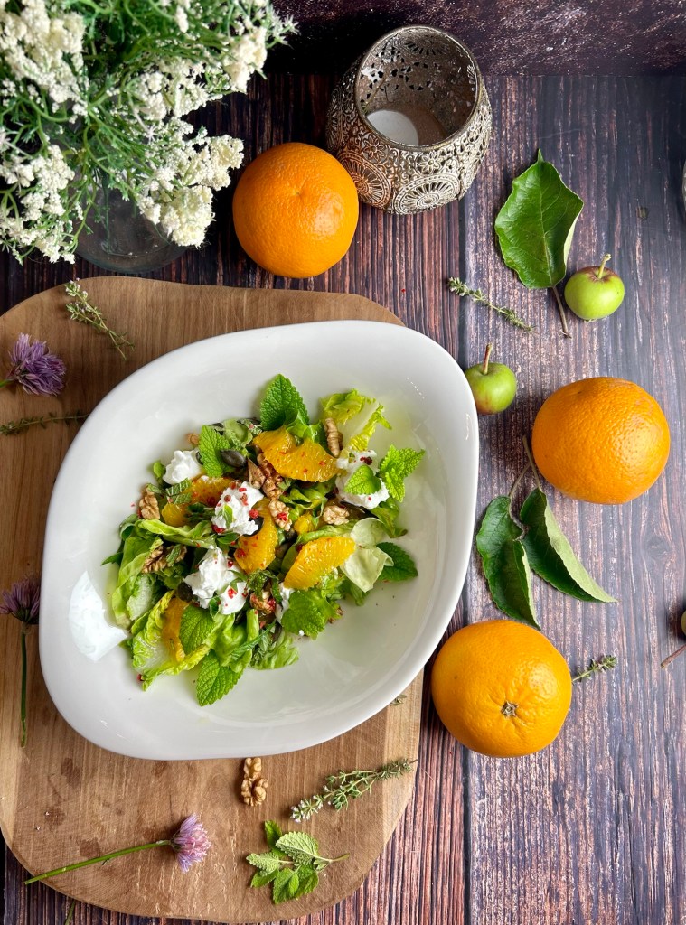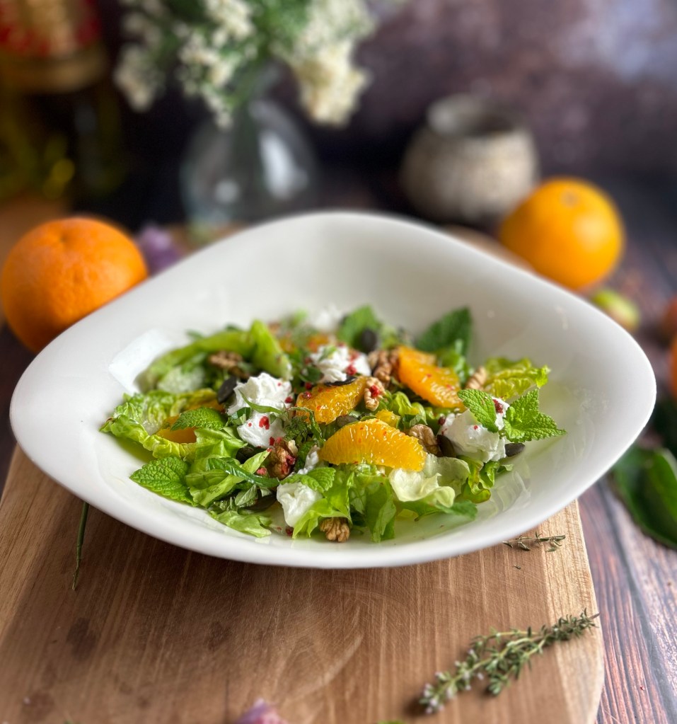 Dieser Salat ist die perfekte Kombination aus süß und herzhaft, mit einem kleinen Knusper-Effekt. Die süßen Orangenspalten mischen sich unter die knackigen Blätter verschiedener Salatsorten, und die gerösteten Nüsse verleihen jedem Bissen eine angenehme Textur. Das wahre Highlight ist jedoch das Orangendressing – eine Mischung aus frischem Orangensaft, Olivenöl, einem Hauch von Weißweinessig und einem Teelöffel Honig für eine leicht süße Note.