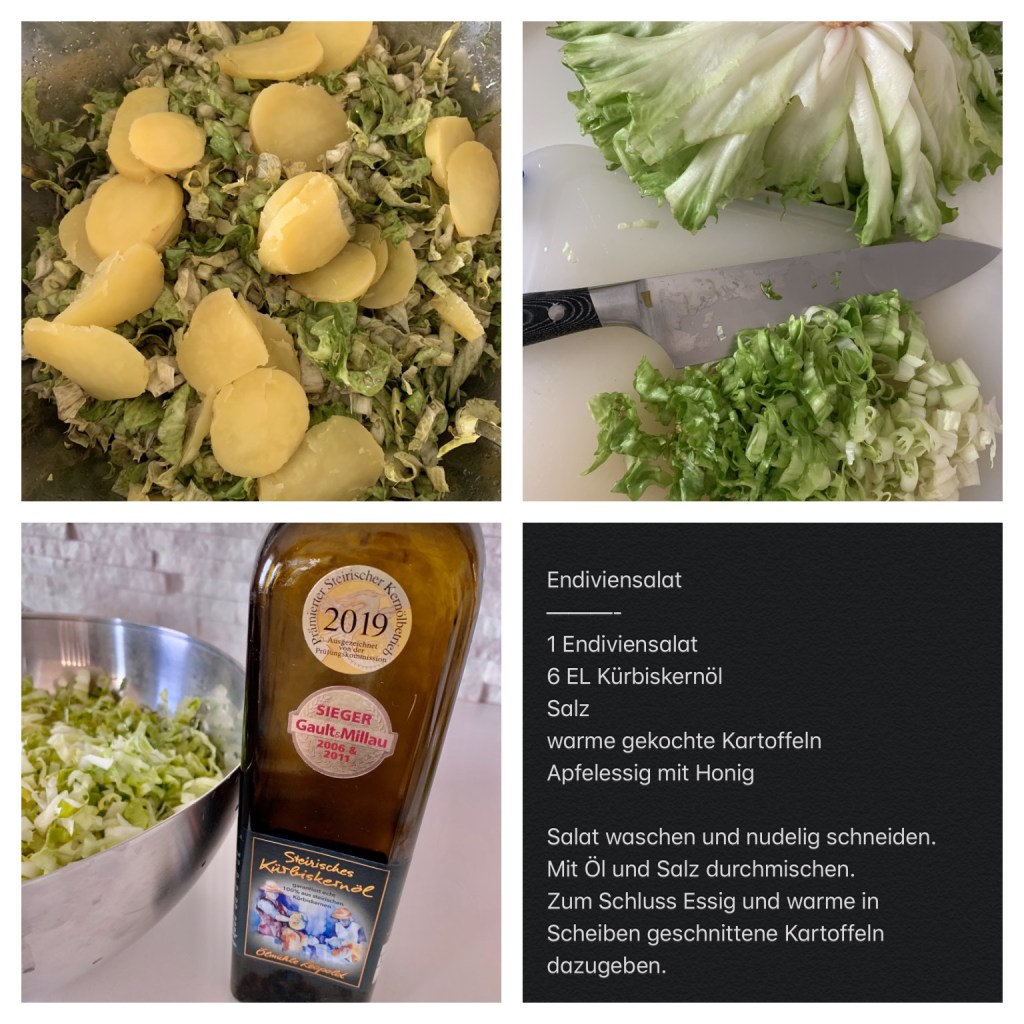 Und gleich noch ein Rezept: Endiviensalat mit warmen Erdäpfeln und Kürbiskernöl, so wie ihn schon Oma zubereitet hat – unser Lieblingssalat!