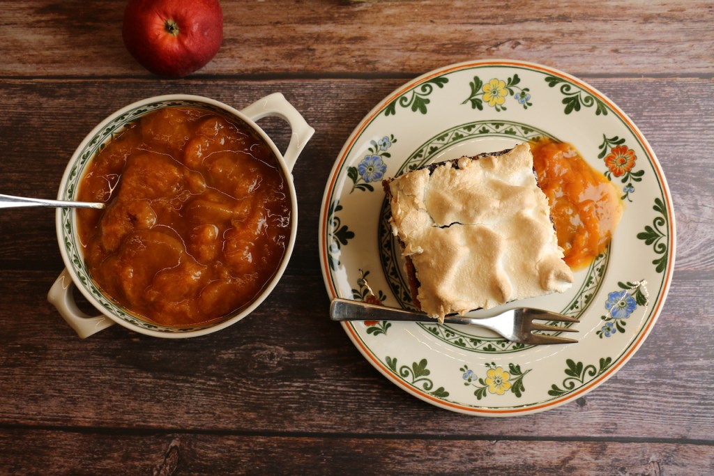 - Oder 3 Eiweiß zu Schnee schlagen und 3 Esslöffel Zucker dazugeben. Auf dem Scheiterhaufen verteilen und im Rohr nochmal 10 Minuten überbacken.