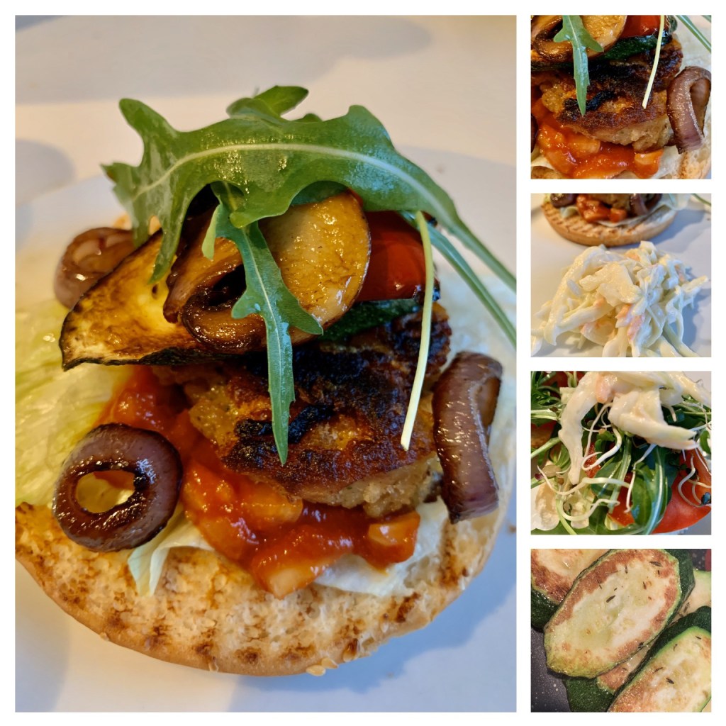 Und wohin jetzt mit den Laibchen? Ganz klar: zwischen zwei Burgerbrötchen. Zusammen mit gebratenen Zwiebelringen, Paprika, Schwammerl und Zucchini.
