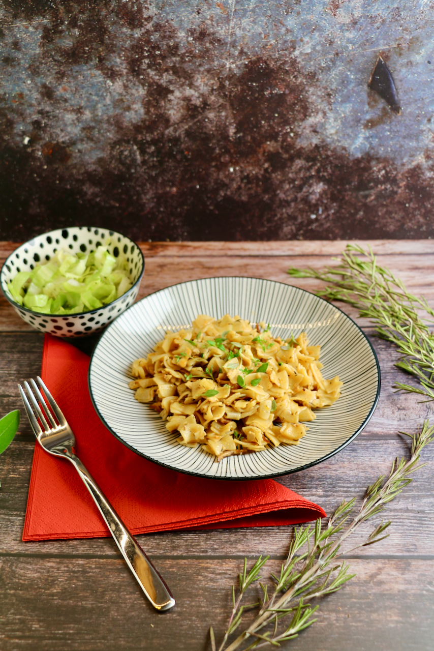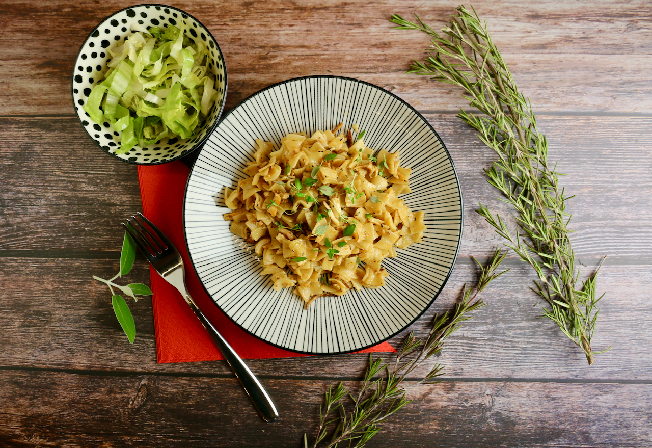 Fleckerlspeis ist traditionelle österreichische Hausmannskost, schon von Großmutter zubereitet, gewürzt mit Majoran, Petersilie oder Thymian. Ein typisches Gericht aus dem österreichischen Traun- und Innviertel, dass traditionell mit Endiviensalat serviert wird. Wir haben allerdings die faschierten Wurstreste durch Tofu ersetzt. Schmeckt mindestens genauso gut, wenn nicht besser ;)!