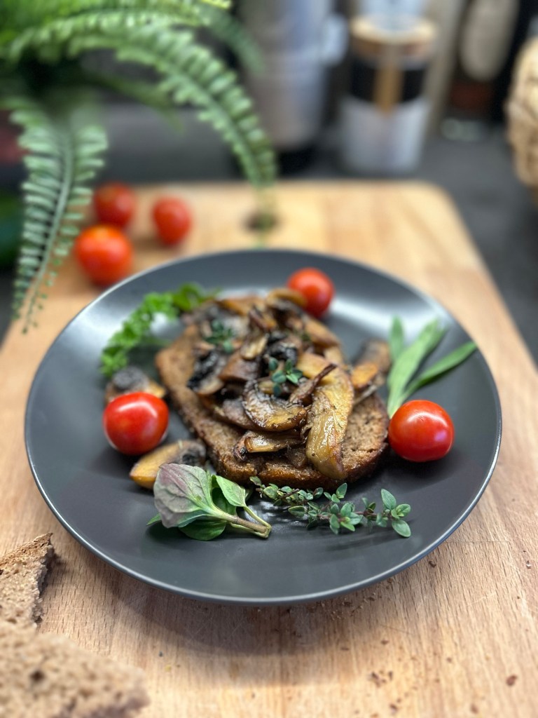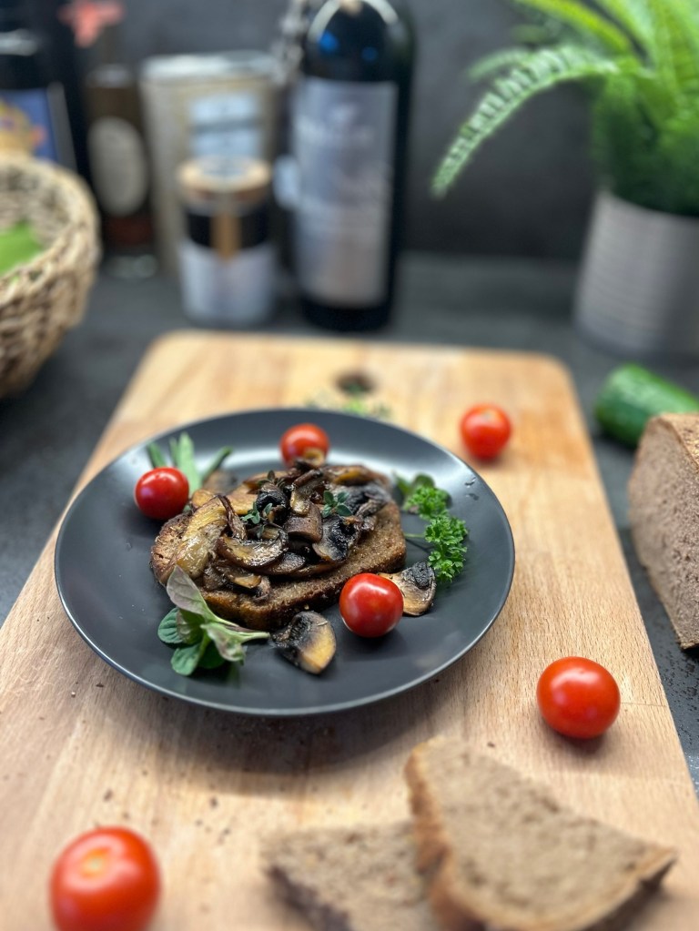 Gebratene Pilze auf gerösteten Brotscheiben