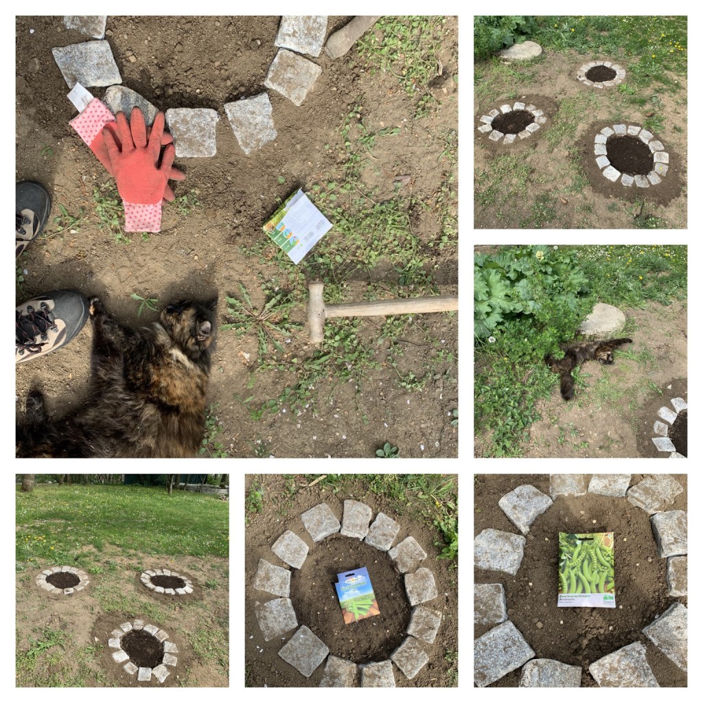 Wir haben uns einfach drei beliebige Stellen in unserem Garten ausgesucht, drei Löcher gegraben, diese mit Pflastersteinen begrenzt und gute Erde eingefüllt. Sniki, unsere Katze, hat uns dabei laut schnurrend geholfen.