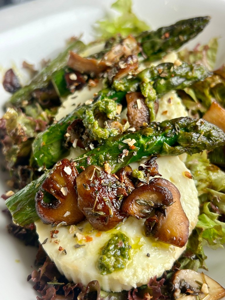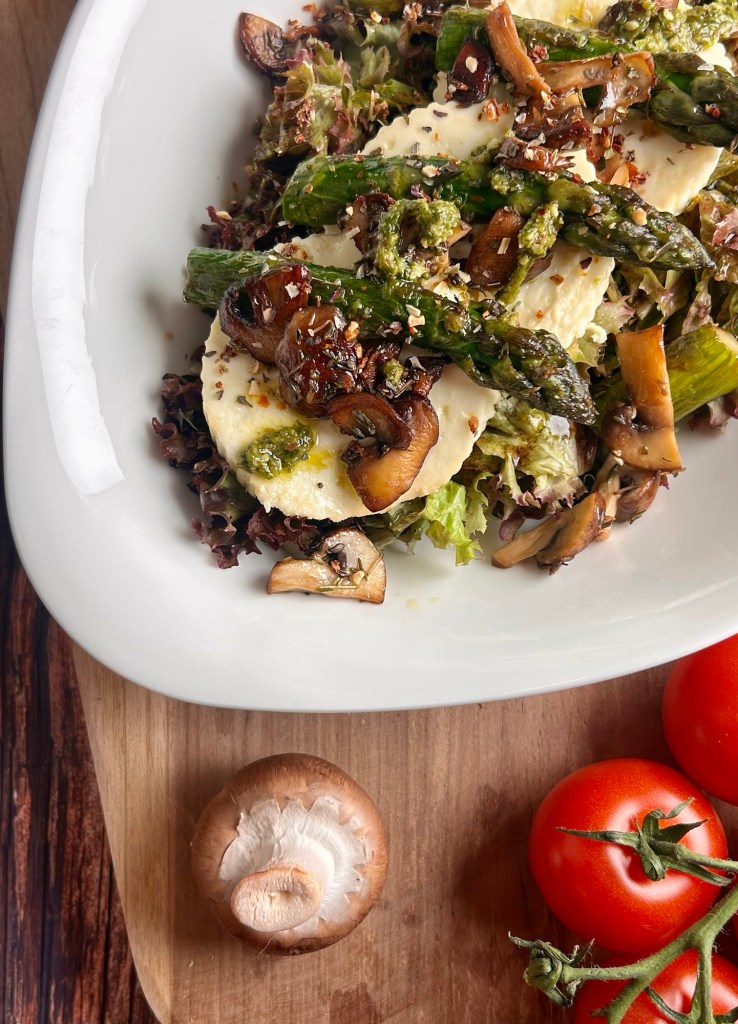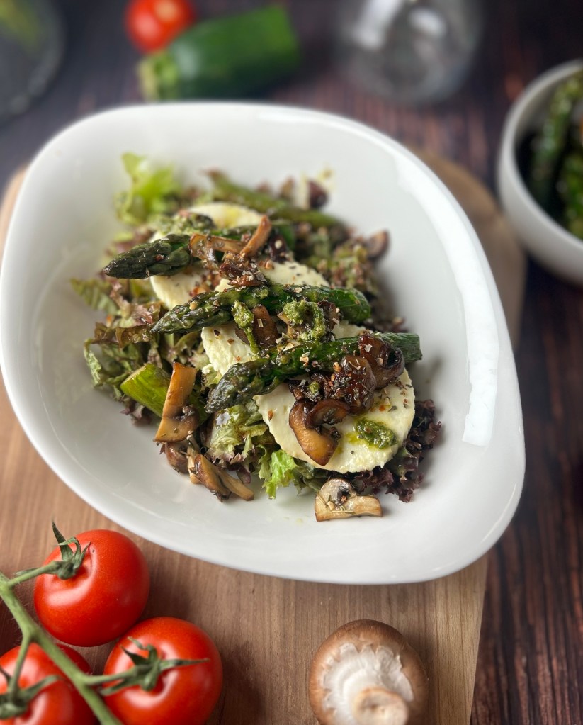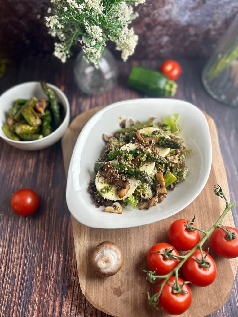 Dieser herzhafte grüne Salat kombiniert frische, knackige Texturen mit gebratenem grünen Spargel, cremigem Ziegenkäse und knusprigen gebratenen Champignons. Abgerundet wird der Salat durch ein würzig-süßes Dressing aus Kürbiskernöl, das diesem Gericht eine besondere Note verleiht.
