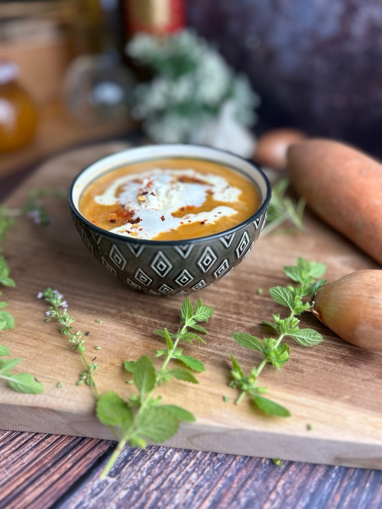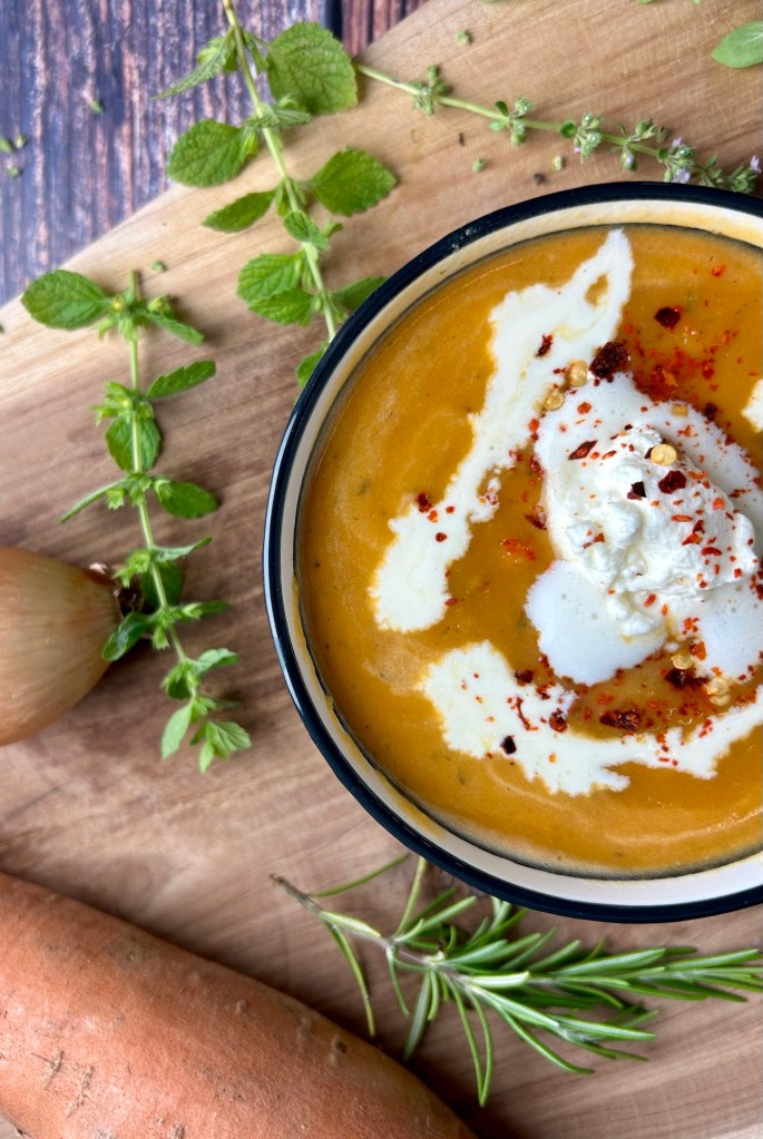 Würzig, cremig, süßlich und ein wenig scharf… so muss die Suppe schmecken. Koriander und Thymian passen fantastisch zur Süße der Süßkartoffel.