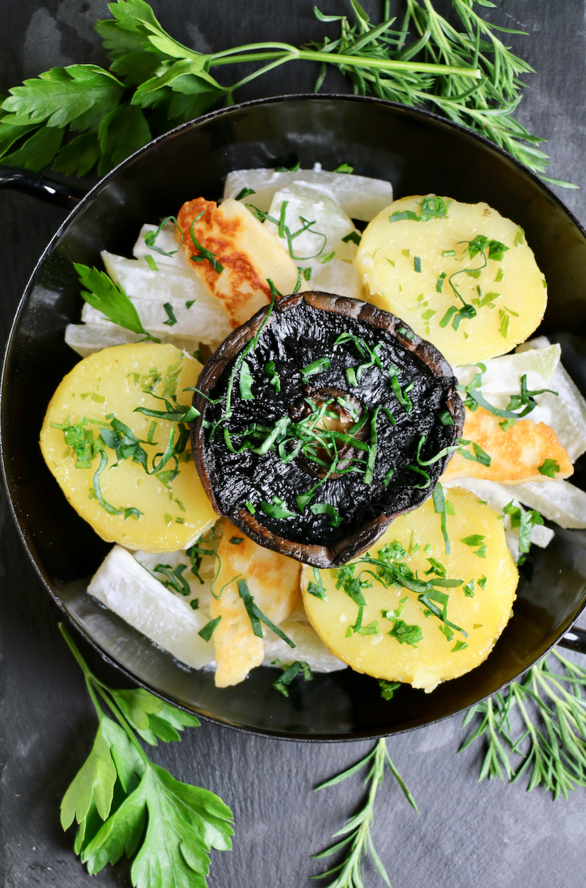 Um dieses Gericht noch unwiderstehlicher zu machen, servieren wir es mit gebratenen Portobello-Pilzen und gekochten Kartoffeln. Die Pilze bringen ein herrliches Aroma ins Spiel, während die Kartoffeln für die nötige Sättigung sorgen. Aber das ist noch nicht alles: Der Grillkäse, leicht angebräunt, fügt eine köstliche käsige Note hinzu, die das Gericht abrundet.