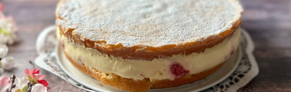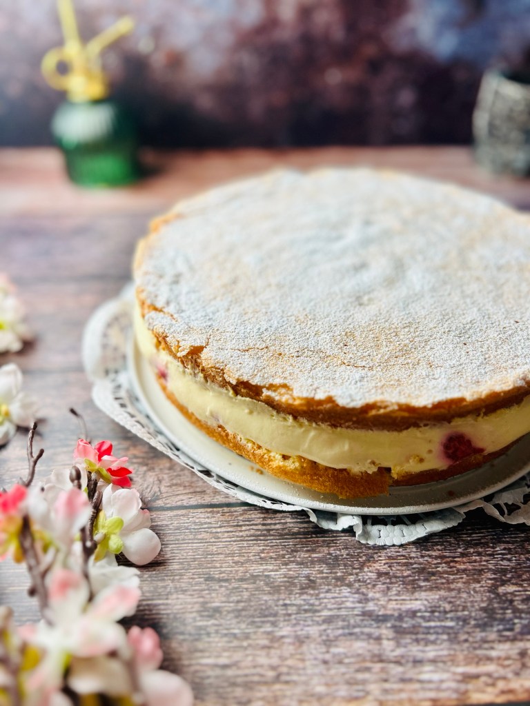 … mit leichtem Biskuitteig, verfeinert mit Vanille, Zitrone und süßen Himbeeren.