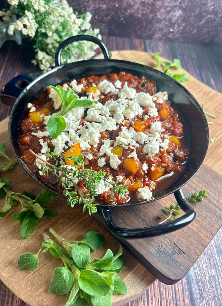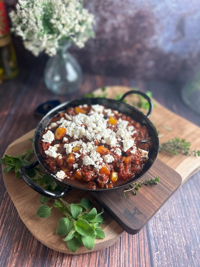 Auberginen, Zwiebeln, Paprika und Tomaten gebraten und mit Feta überbacken – ein kulinarisches Highlight!