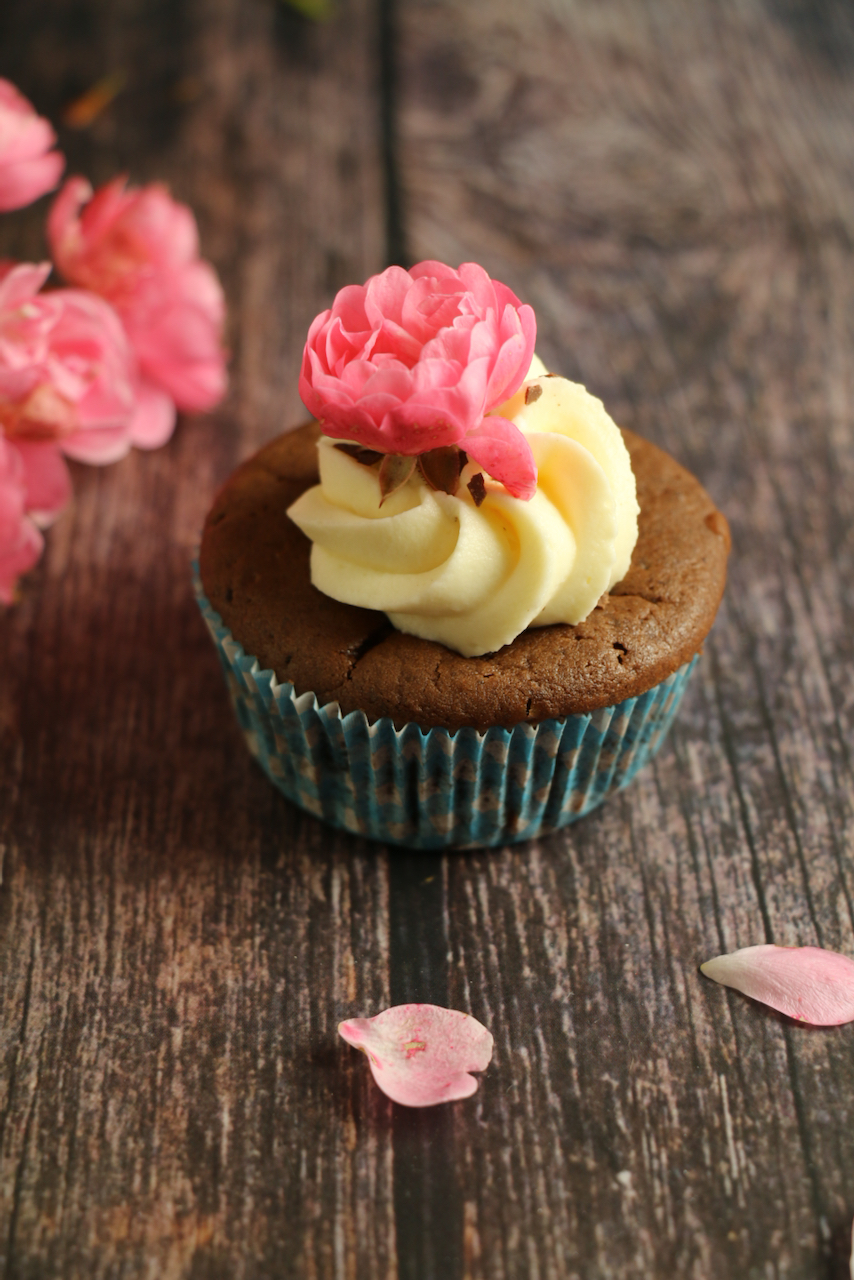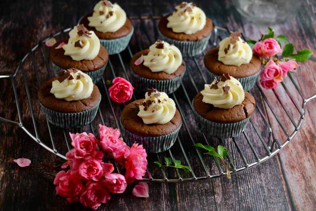 Unsere Rosen blühen zur Zeit so wunderschön und duften fantastisch. Welche Mehlspeise passt also auf einen Kaffeetisch mitten im Garten neben dem Rosenbeet? Genau, Rosen-Schoko-Cupcakes!