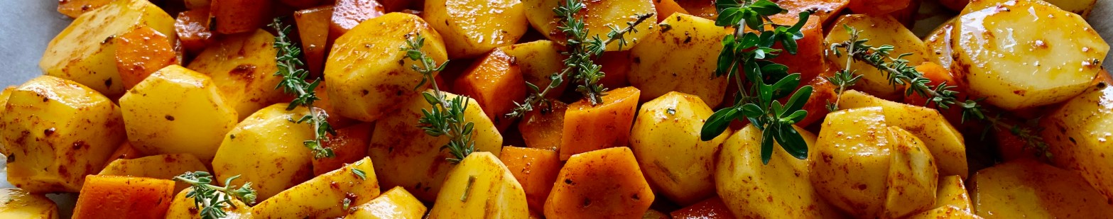 Na dann, her mit dem Thymian! Lasst uns heute gebratene Kartoffeln und Karotten aus dem Ofen mit Thymian-Zitronen-Butter zaubern.