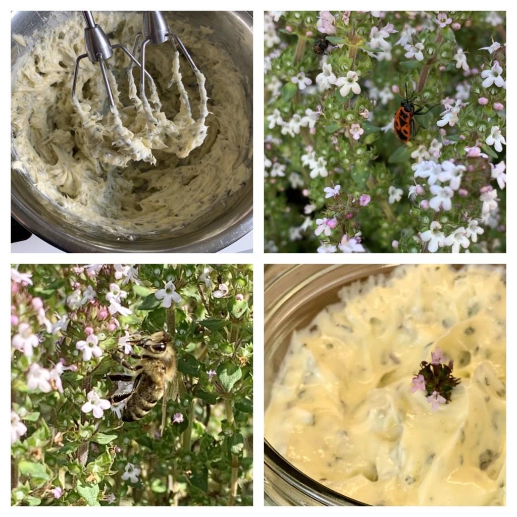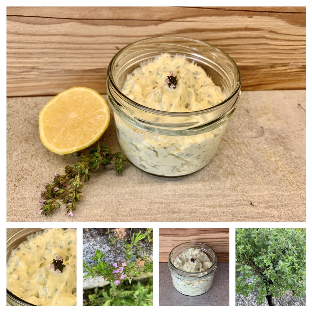 Dazu gibt es Thymian-Zitronen-Butter: Thymianblätter fein hacken, Schale von 1-2 Zitronen abreiben. Knoblauch pressen und alles mit der sehr weichen Butter vermischen. Ein wenig salzen nicht vergessen und eventuell einen Löffel Olivenöl wegen der Konsistenz druntermischen. In Gläser abfüllen.
