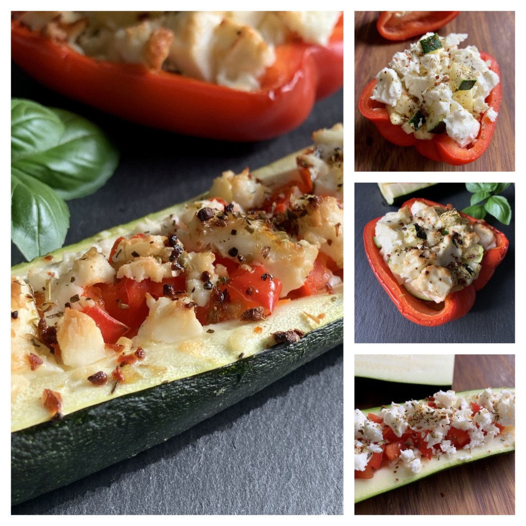 Für die gefüllten Paprika und Zucchini beide Gemüsesorten halbieren und aushöhlen. Das Innere der Zucchini würfeln und mit Öl und unserem selbst gemachten mediterranen Kräutersalz mischen. In die Paprikahälften einfüllen.