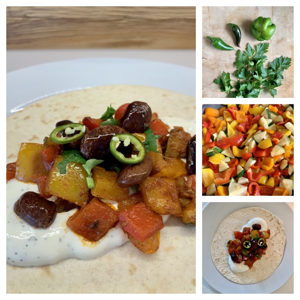 - Gemüse klein schneiden und in Öl braten und mit Salz, Pfeffer, Paprikapulver, Koriander, Chili und Oregano würzen.