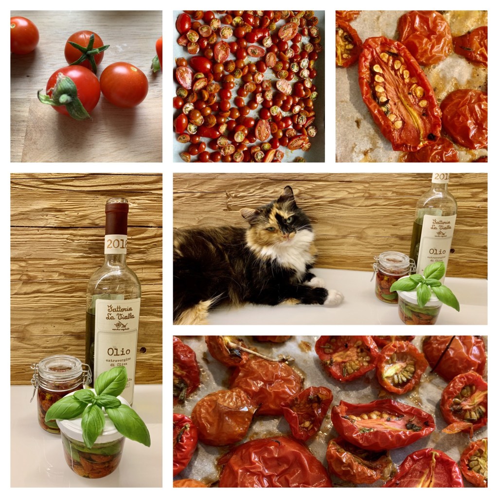 Und weil gerade so viele Tomaten im Glashaus reif sind, haben wir gleich auch noch getrocknete und in Öl eingelegte Tomaten hergestellt.