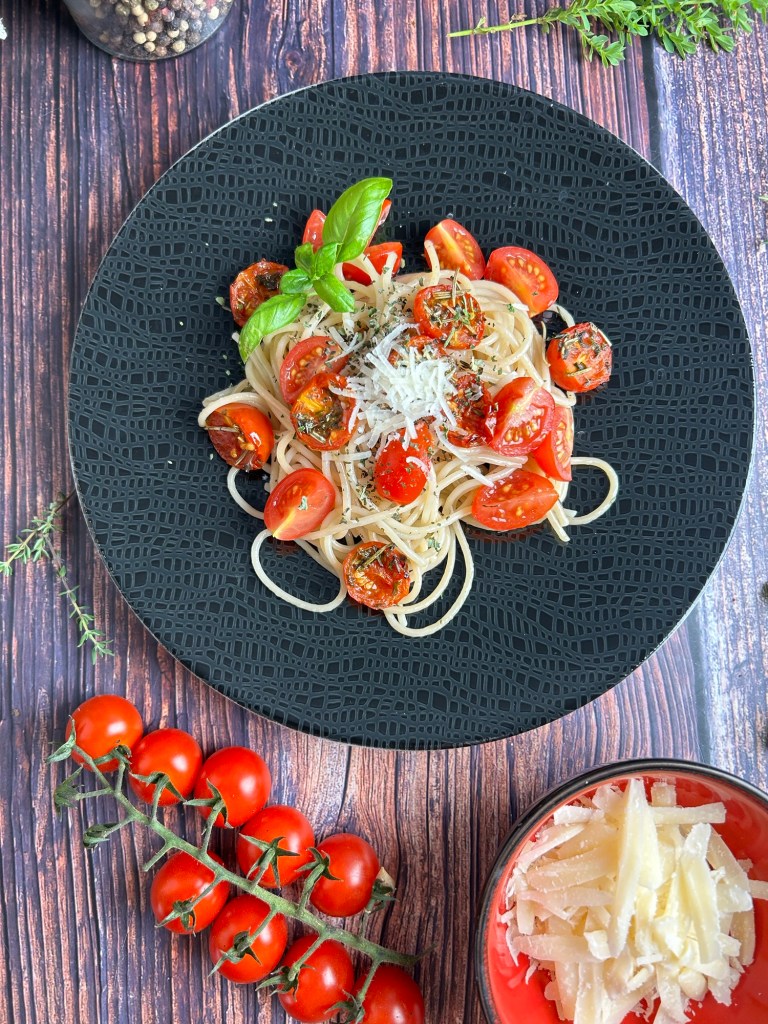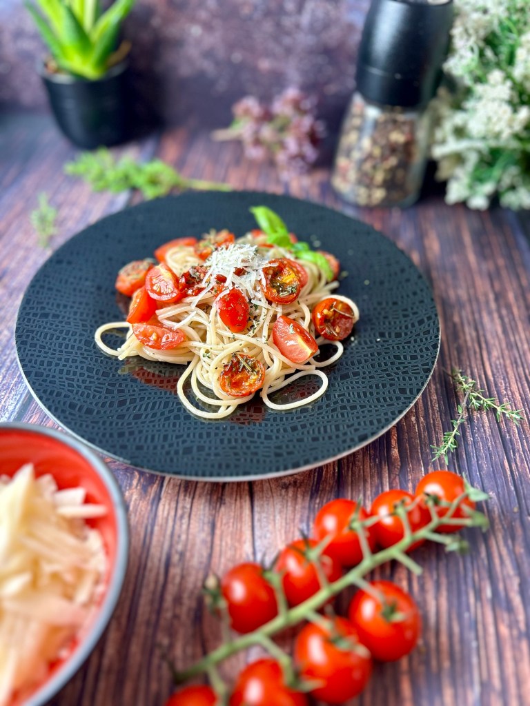Ein einfaches und schnelles Rezept für Pasta al pomodoro mit frischen und getrockneten Tomaten und Basilikum. Perfekt für ein leichtes und aromatisches Abendessen.