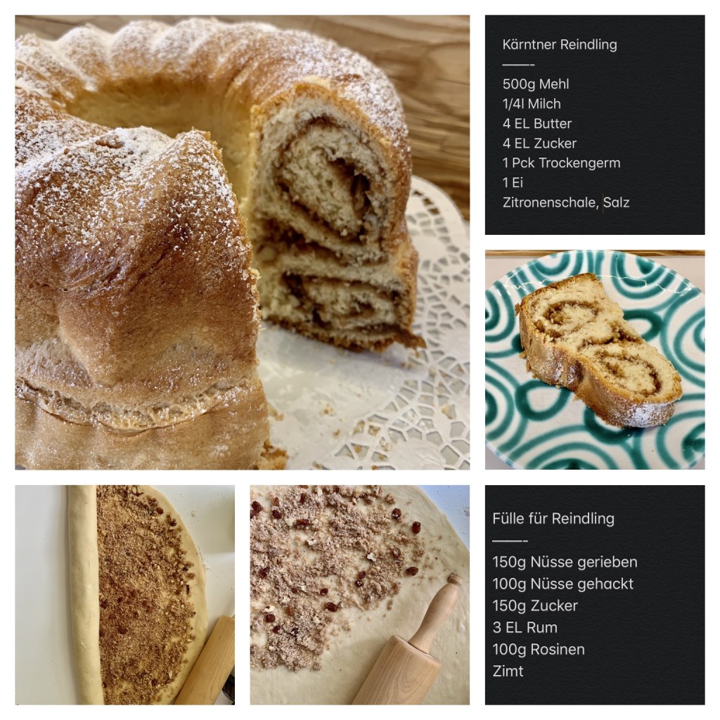 Gefüllt wird der süße Germteig mit viel Zimt und Zucker und meist auch mit Nüssen und Rosinen. Aber das kann variieren, denn anscheinend gibt es so viele Originalrezepte für Reindling, wie Einwohner in Kärnten.