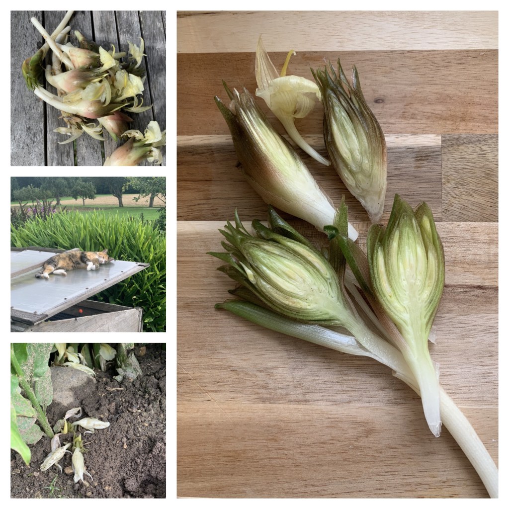 – Im heurigen feuchten Jahr 2020 strotzt das Beet nur so vor Wachstum, irgendwie sieht es wie ein niedriger, dichter Maisacker aus. Ende August habe ich nachgesehen: überall kommen aus dem Boden die knubbligen Blütenstände, die ich heute geerntet habe (einfach rausziehen).
