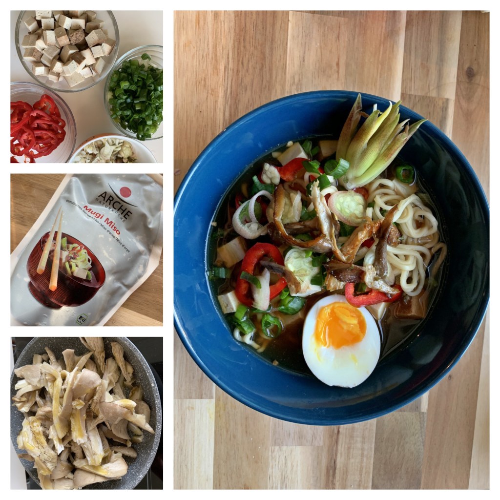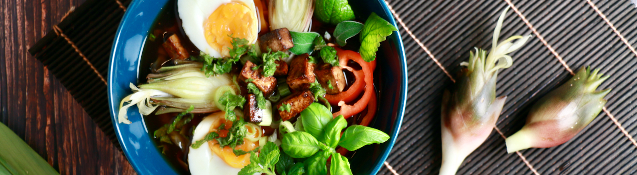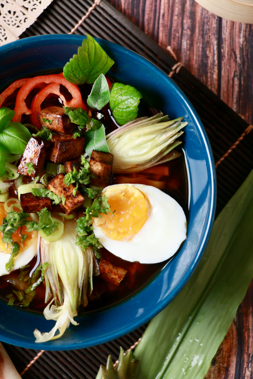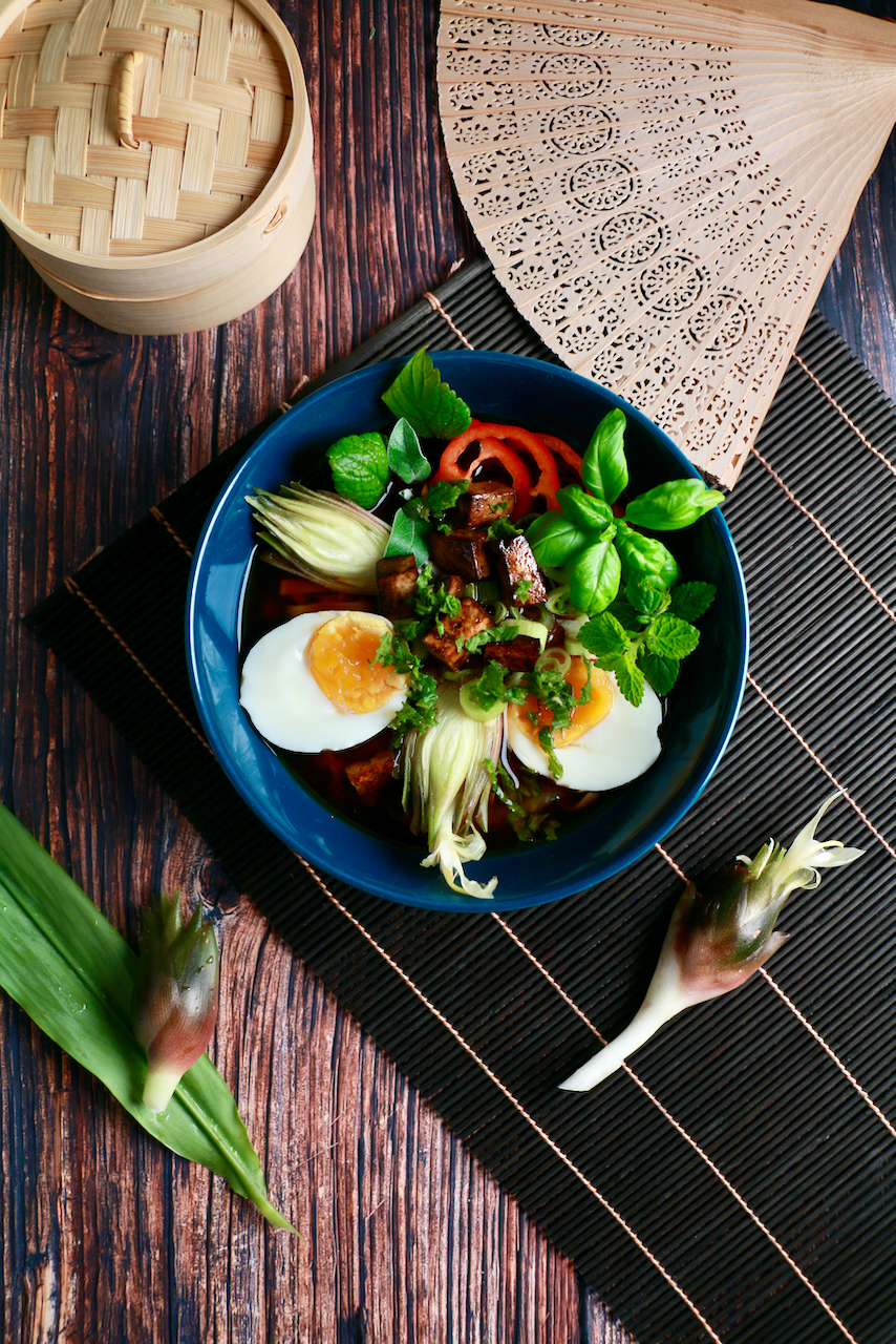Deshalb gibt es heute japanische Nudelsuppe mit leckeren Einlagen wie Räuchertofu, roten Paprika und Frühlingszwiebeln. Und ein weich gekochtes Ei sollte bei Ramen-Suppe auch nicht fehlen.