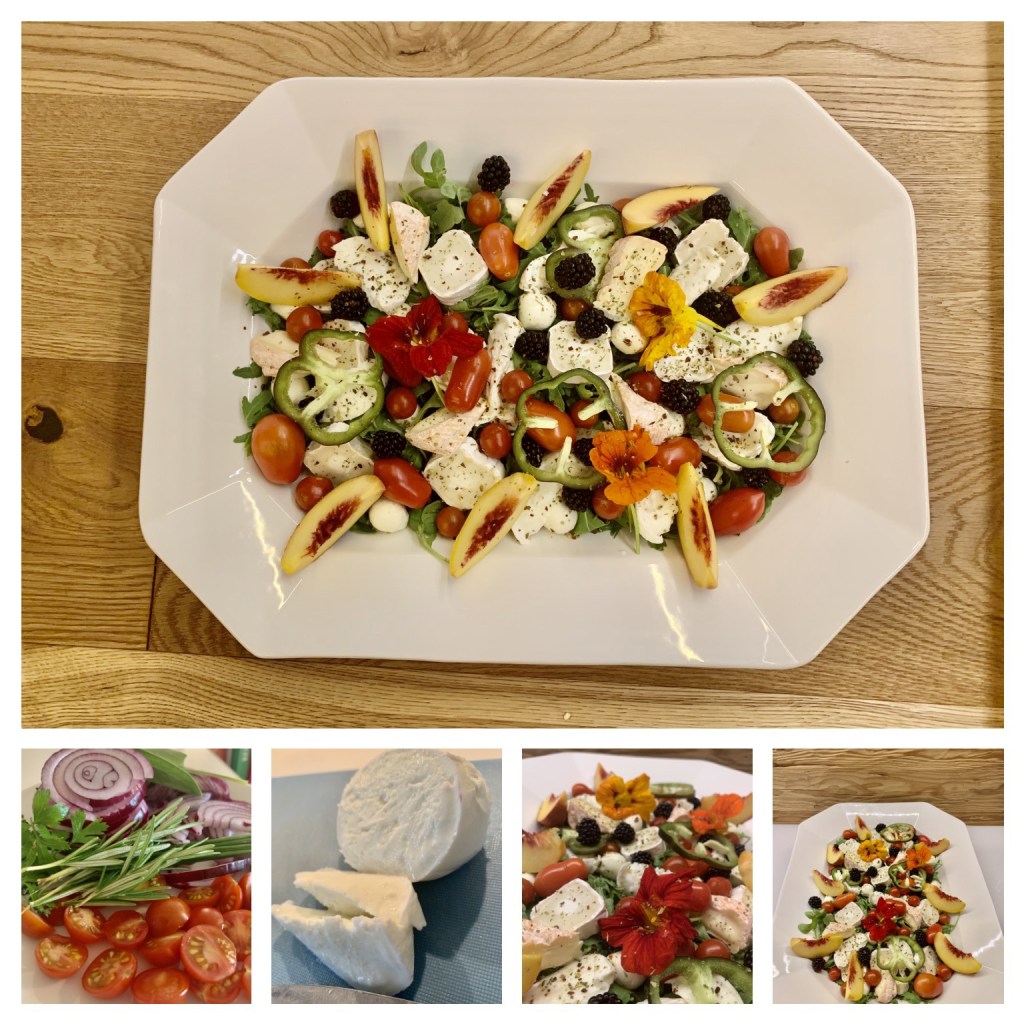 - Salat waschen, Gemüse schneiden und dekorativ auf einem großen Teller anrichten. Käse in Stücke schneiden und darauf legen. Mit Blüten und Obst dekorieren. Mit Dressing beträufeln und servieren.