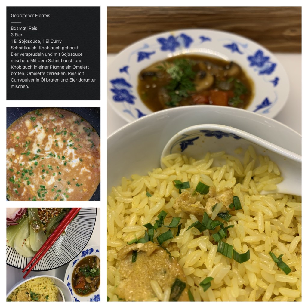 - Reis mit Salz und Currypulver kochen und anschließend mit Knoblauch und Frühlingszwiebeln in Öl braten und Eierstreifen darunter mischen.