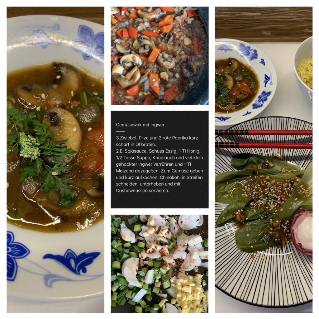 Viele Gemüsesorten sind jetzt überall frisch zu haben. Beim Gemüsewok gibt es aber keine strengen Regeln, erlaubt ist hier was gefällt bzw. schmeckt. Nur Ingwer ist bei uns Pflicht! Frische Ingwerwurzel haben wir immer daheim, denn alle paar Tage gibt es Ingwertee, Ingwersaft, Suppe mit Ingwer, Gurkensalat mit Knoblauch und Ingwer oder eben die Gemüsepfanne mit Ingwer.