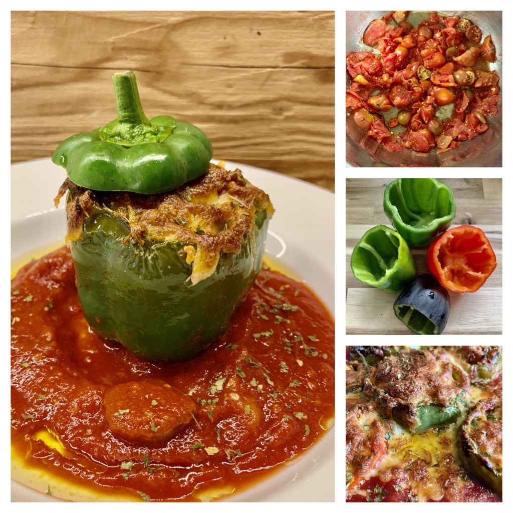 Wir haben den Klassiker heute neu interpretiert: vegetarisch gefüllte Paprika in Tomatensauce.