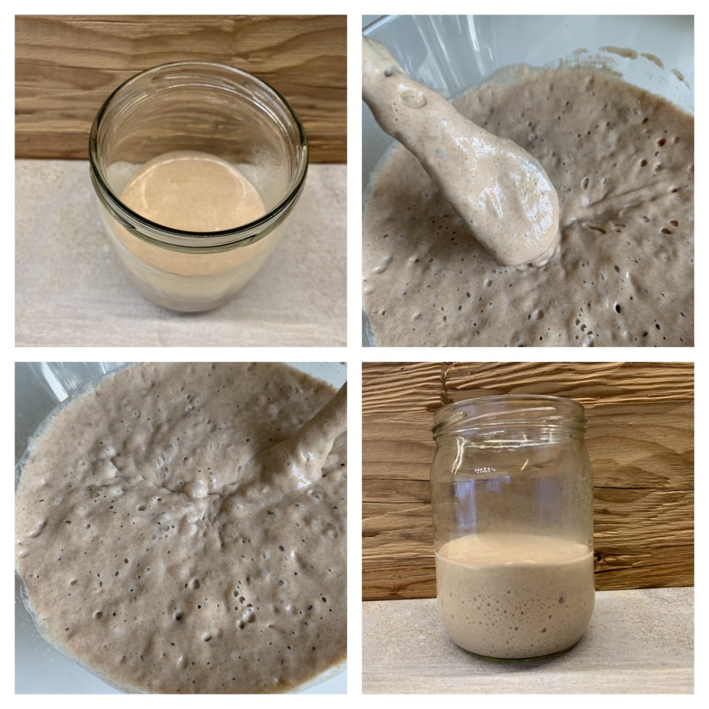 Am zweiten Tag macht ihr den Vorteig. Sauerteig, Mehl und Wasser zu einem klebrigen Teig (wie fester Palatschinkenteig) rühren. Das geht ganz leicht mit dem Löffel. Dann heißt es warten. Einen Tag lang.
