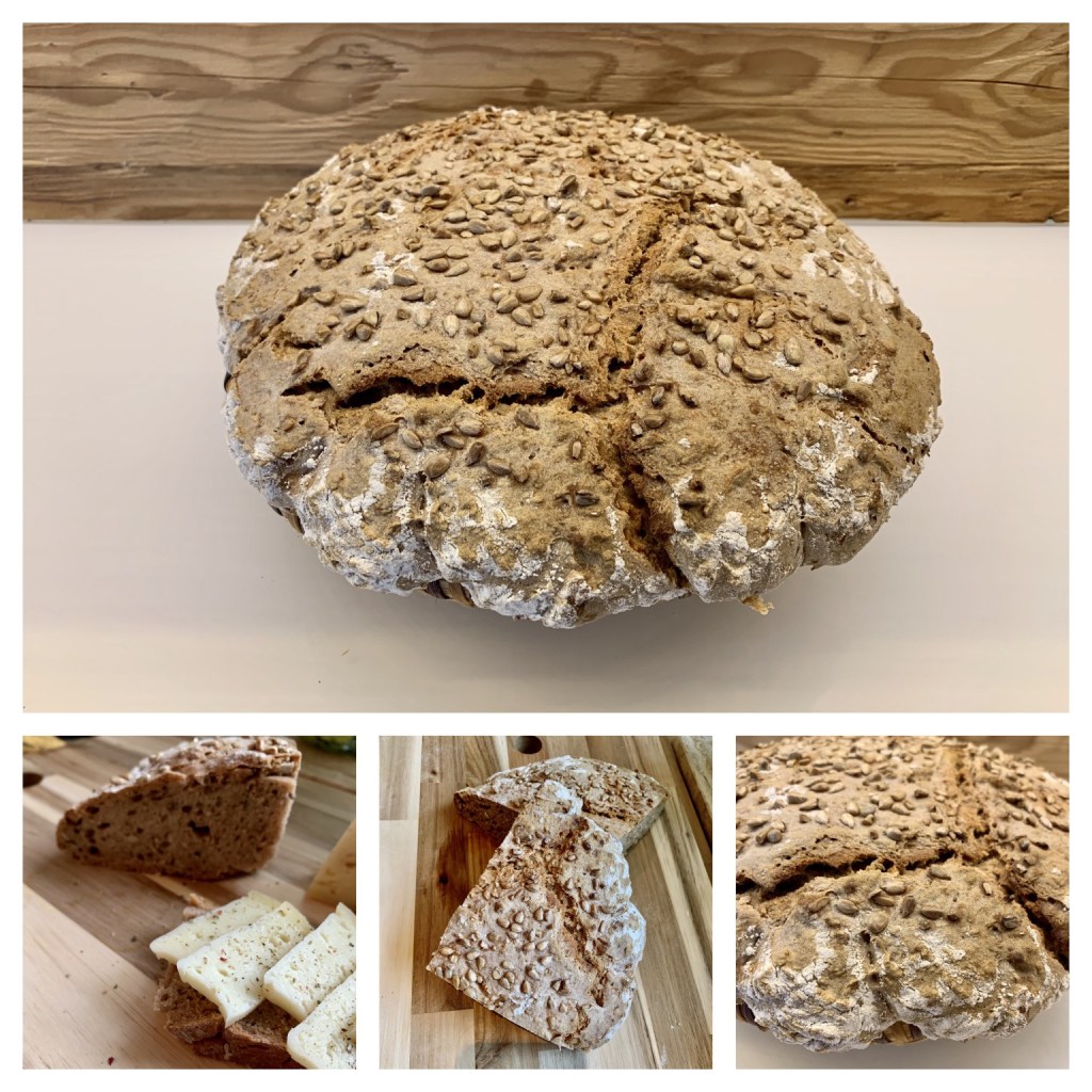Ofen vorheizen auf 250 Grad. Brot ‚einschießen‘, also auf das heiße Blech geben. Mit einem Messer kreuz und quer ein wenig einschneiden und mit Wasser einstreichen. Dann die Sonnenblumenkerne darauf verteilen. Tipp: jetzt nochmal darübersalzen, denn das ergibt eine noch würzigere Kruste.