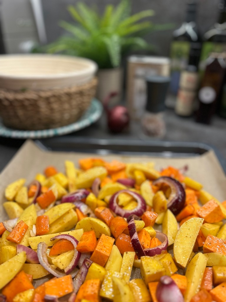 - Kartoffeln, Karotten, rote Rüben, Süßkartoffeln und Zwiebel schälen. Alles in grobe Stücke zerteilen.