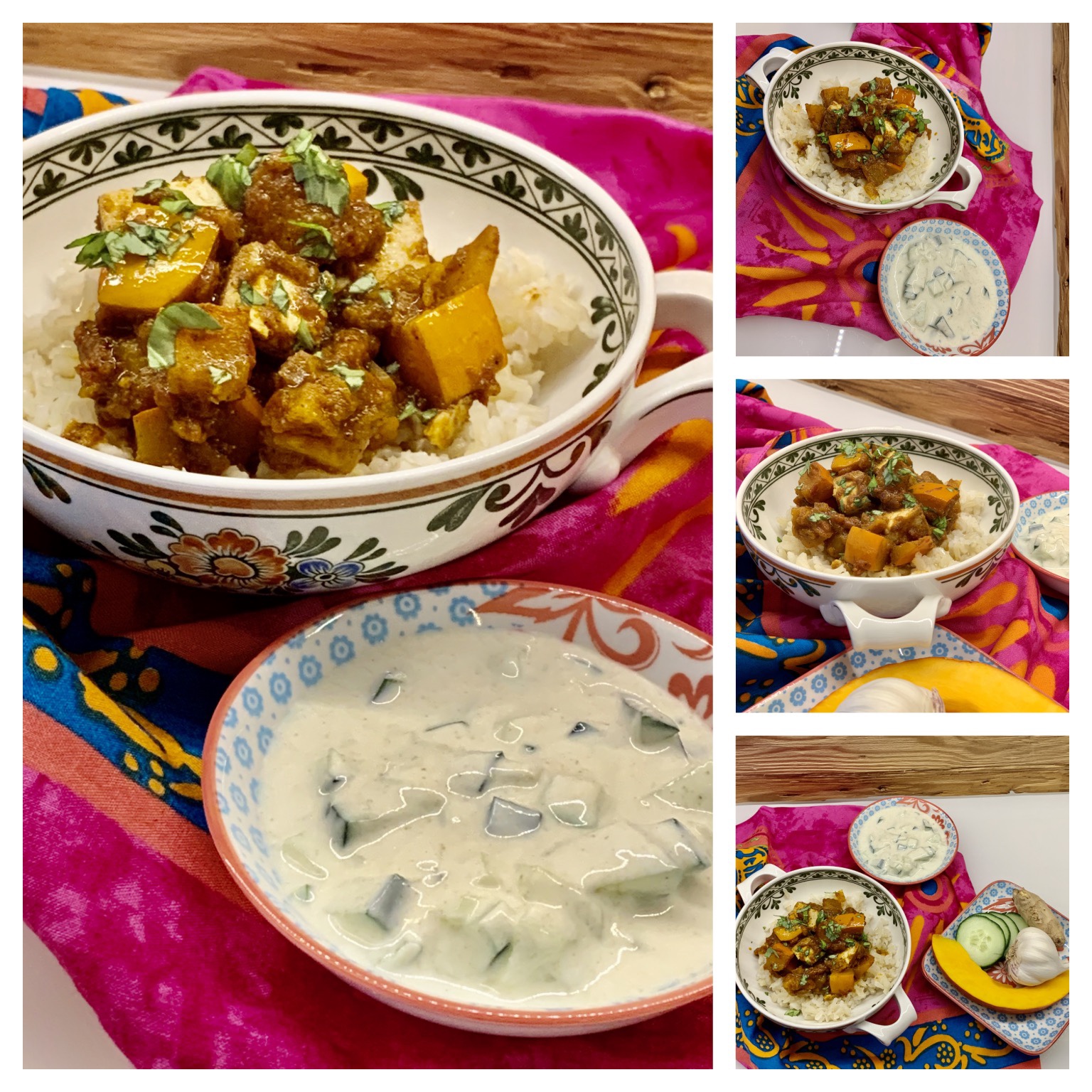 Auf alle Fälle sind Gewürze wie Koriander, Cumin, Garam Masala und Gemüse wie Zwiebel, Knoblauch und Tomaten enthalten. Der Rest kann je nach Saison ausgetauscht werden. Jetzt im Herbst haben wir uns klarerweise für Kürbis entschieden.