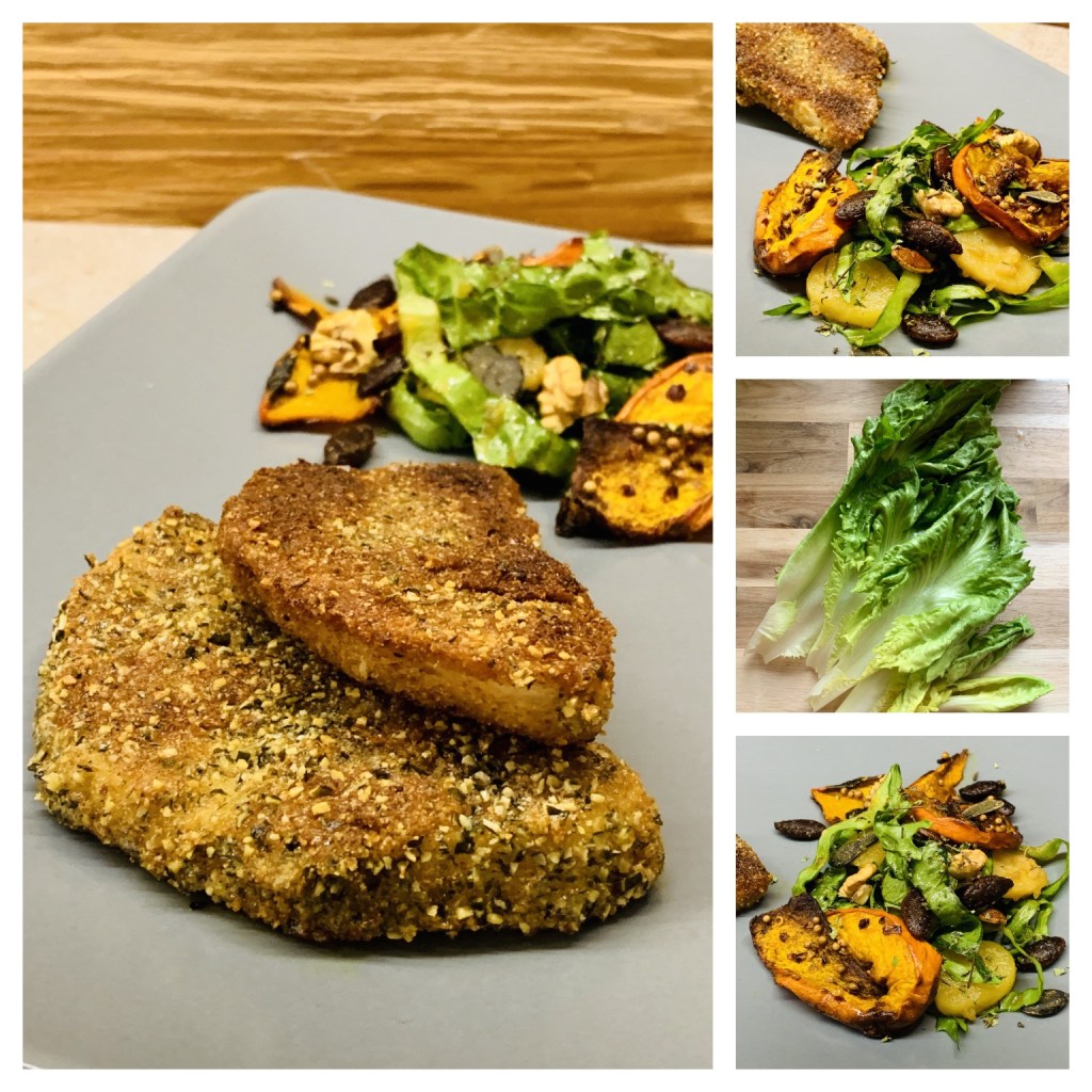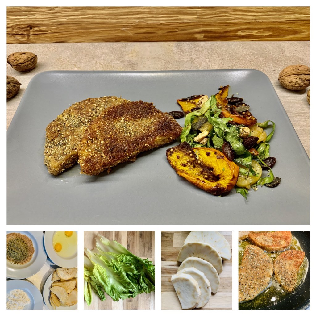 Für die Schnitzel die Selleriescheiben in Salzwasser weich (aber nicht zu weich!) kochen. Erst in Mehl, dann in gesalzenem und versprudeltem Ei wenden und dann in Brösel-Kürbiskern-Gemisch panieren. In reichlich Öl nicht allzu heiß knusprig braten.