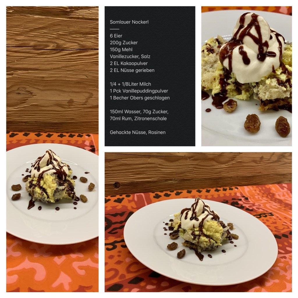 Somloer Nockerl werden aber auch im Burgenland gerne gekocht. Es ist ein Dessert mit drei verschiedenen Biskuitböden (heller Biskuit, Schoko- und Walnussbiskuit), die mit Rum-Zuckersirup getränkt und mit Rumrosinen belegt werden. Zwischen den Schichten ist eine Vanillecreme.