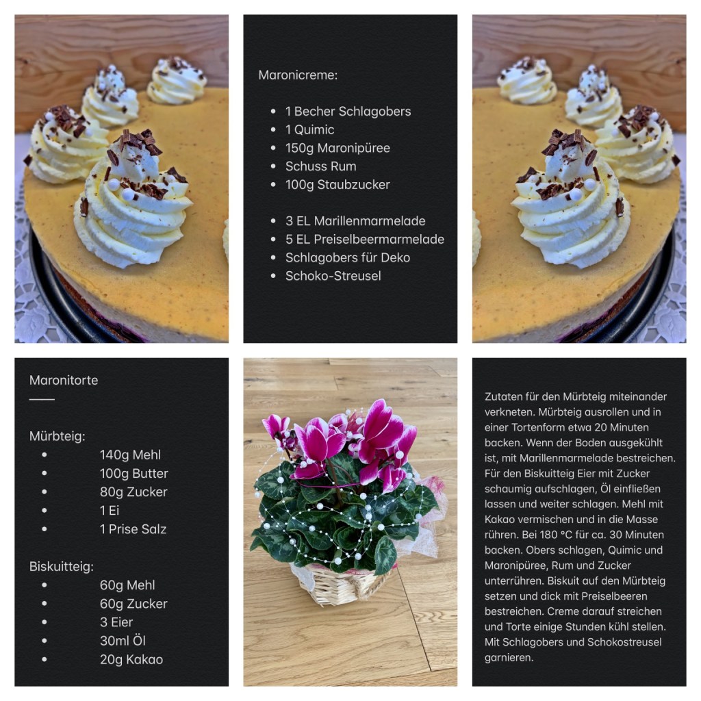 Herbst und Maroni gehören zusammen. Deshalb probieren wir eine Maronitorte mit Preiselbeeren. Wir backen dazu zwei Teigböden, einmal einen Mürbteig-Boden und dann eine Schoko-Biskuit Schicht. Dazwischen kommt Marillenmarmelade. Auf den Schoko-Biskuit streichen wir dann die Preiselbeer-Marmelade dick drauf und schließlich kommt zum Schluss die Maroni-Creme. Am nächsten Tag die Torte noch mit Obers und Schokolade dekorieren und fertig ist unsere Herbst-Nachspeise.