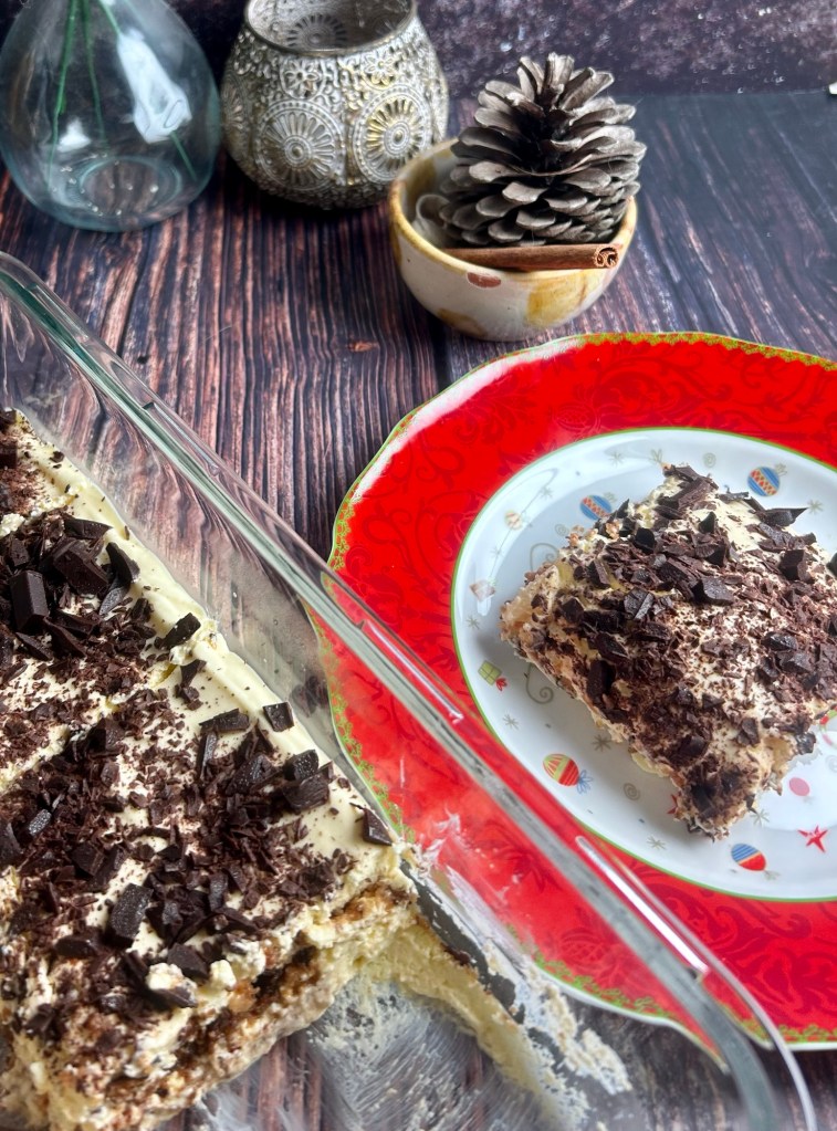 - Zweite Lage mit getränkten Biskotten darauflegen und mit der restlichen Creme abschließen.