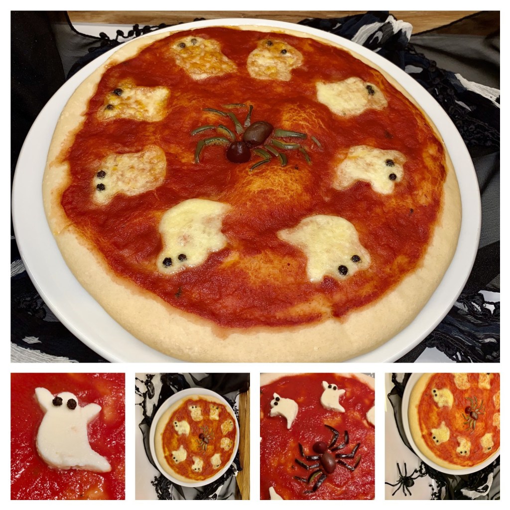 Die Geister haben wir aus Mozzarella ausgestochen, die Spinne aus Oliven und Paprika gebastelt und die Pizza damit belegt.