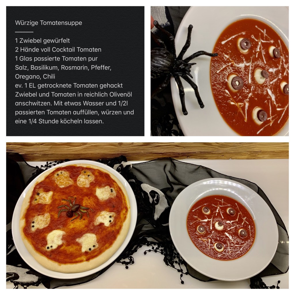 Das Rezept für die Pizza findet ihr hier. Als Vorspeise gibt es Tomatensuppe mit Glubschaugen.