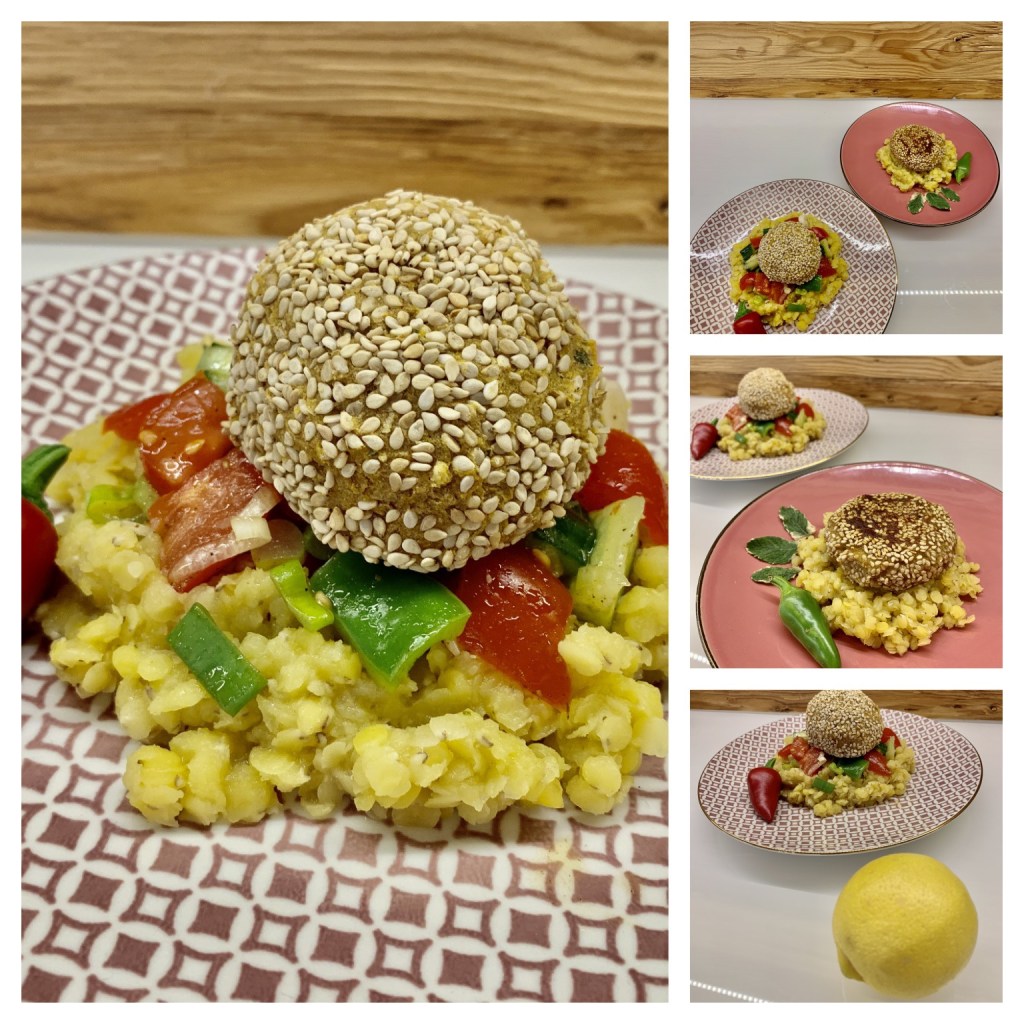 Da dürfen in unserer Rezeptesammlung natürlich Falafel nicht fehlen. Das Gericht stammt aus der arabischen Küche. Meist wird es dort frittiert an Imbiss-Ständen angeboten. Wir haben aber zwei andere Zubereitungsarten gewählt: einmal im Rohr gebacken, als sehr gesunde und fettarme Variante. Zum anderen haben wir die Falafel-Bällchen etwas flach gedrückt und in der Pfanne mit etwas Öl knusprig gebacken.