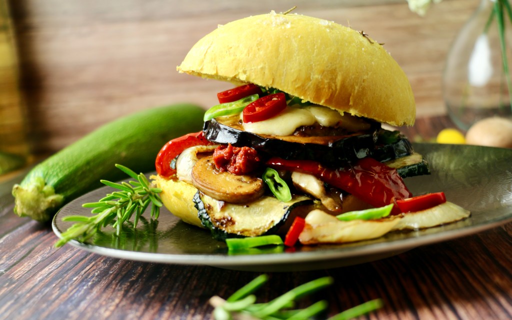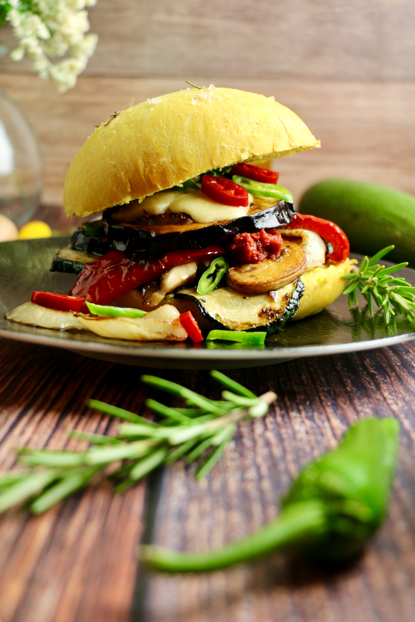 Wir lieben Burger, aber natürlich nur die fleischlose Variante. Statt einem Patty haben wir uns heute für in der Pfanne knusprig gebratene Auberginen, Zucchini und Zwiebeln entschieden. Geschmolzener Käse darf natürlich bei einem richtigen Burger auch nicht fehlen. Deshalb haben wir auf jede Auberginenscheibe eine Scheibe Mozzarella gelegt und im Rohr kurz überbacken.