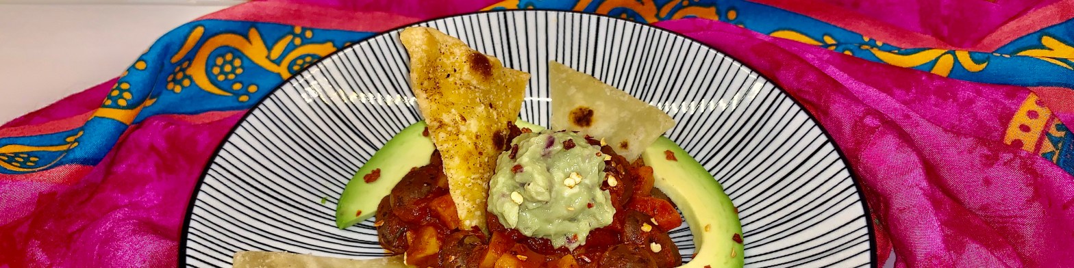 Bohneneintopf mit Guacamole und Tortilla Chips