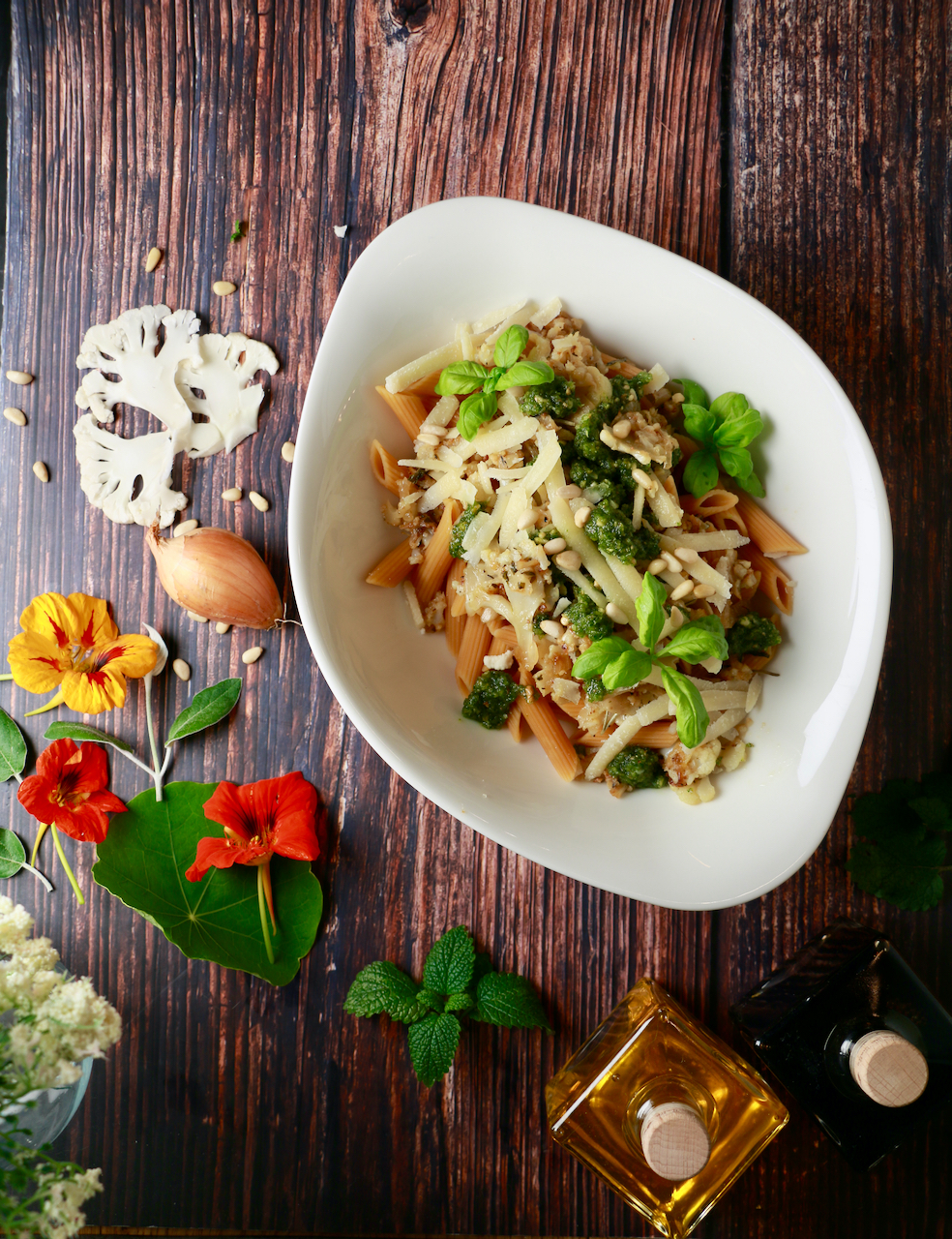 - Die Penne kochen. Nudeln mit Karfiol, Pesto und Parmesan anrichten.