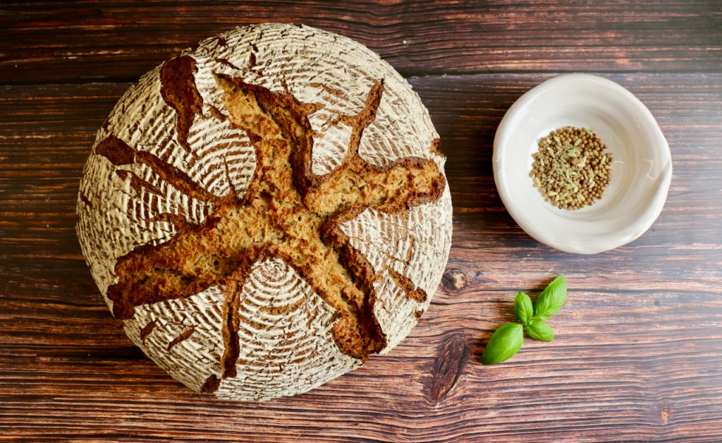 Dieses Mal backen wir ein sehr rustikales Brot. Wir verwenden die Gewürze – Anis, Fenchel, Koriander und Kümmel – im Ganzen und mahlen sie nicht vorher fein oder zerstoßen sie im Mörser. Außerdem wird dieses Mal das Brot nicht mit dem Bäckermesser kunstvoll eingeschnitten. Nein, wir wollen, dass es unkontrolliert aufreißt. Sieht doch trotzdem wunderschön aus, oder?