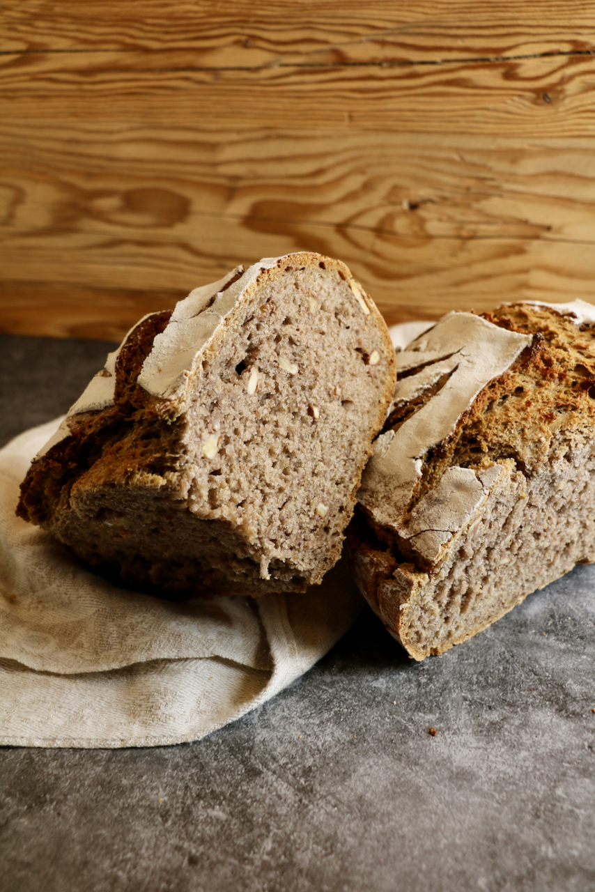 Heute backen wir ein saftiges Roggen-Dinkel-Mischbrot, zur Hälfte mit Vollkornmehl und natürlich mit unserem Roggensauerteig ‚Sniif‘. Dazu kommen eine ganze Menge gesunder Walnüsse.