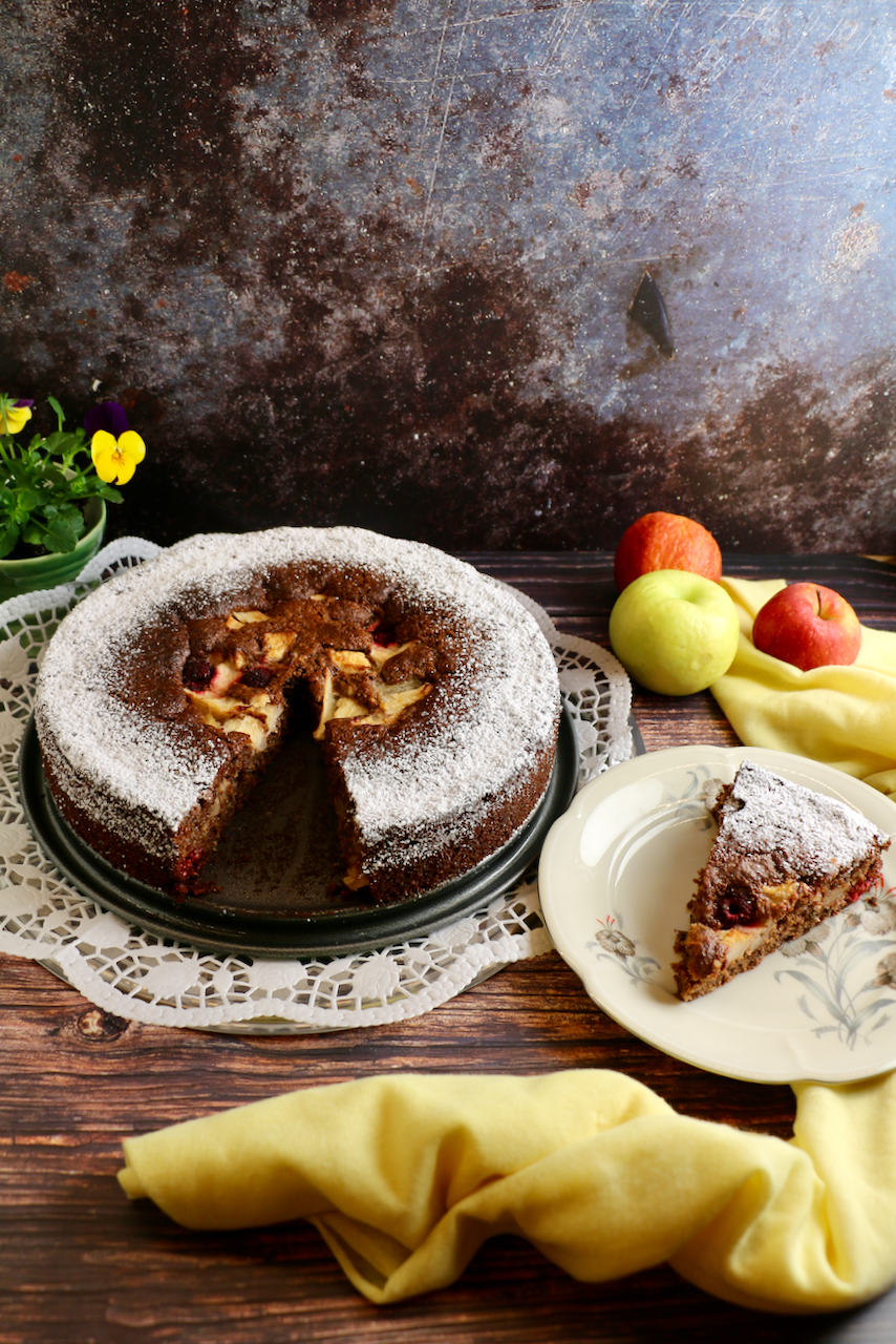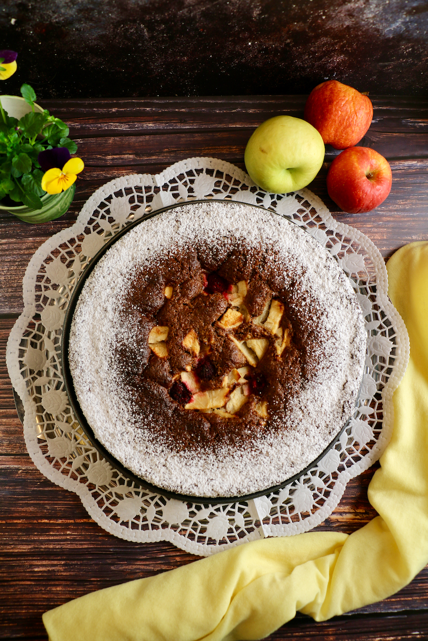 Dieser Becherkuchen mit Joghurt, Vollkornmehl und geriebenen Kürbiskernen ist ein sehr einfach und schnell zubereiteter Kuchen. Mit Apfelstücken und Himbeeren ist er dazu noch richtig fruchtig.