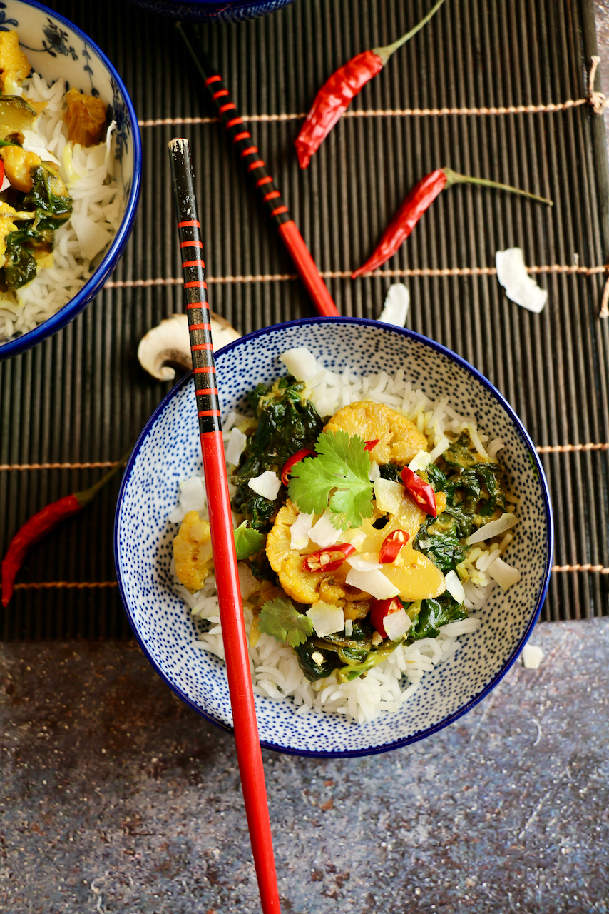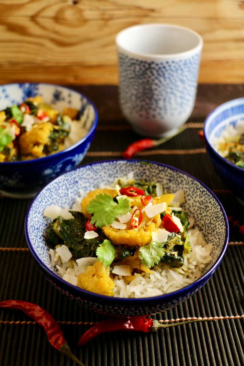 Der Star in unserem heutigen Curry ist der Karfiol, dem unserer Meinung nach viel zu wenig Beachtung geschenkt wird. Er ist das arme Aschenputtel unter den Gemüsesorten, aber heute wir er mal ganz groß gefeiert. Vom Karfiol wird im Gegensatz zu anderen Kohlarten wie Kraut nicht die Blätter, sondern der Blütenstand als Gemüse verwendet. Er ist also ein Gemüse aus vielen kleinen ungeöffneten Blüten – wie schön!