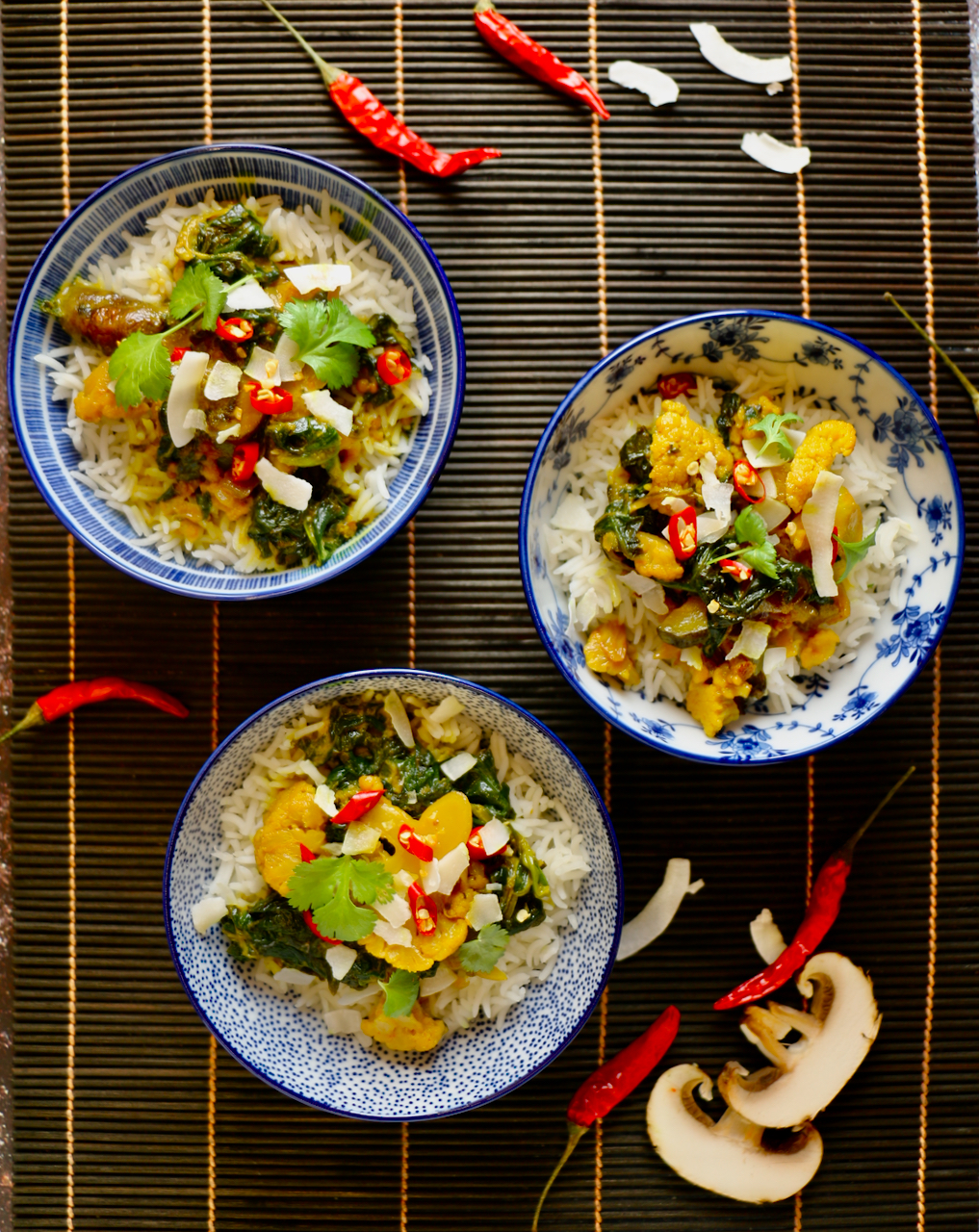 - Mit Basmati-Reis anrichten und mit Korianderblätter, Chili und Kokoschips garnieren.