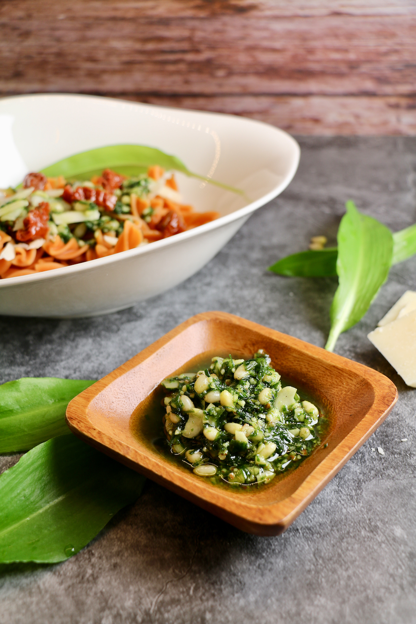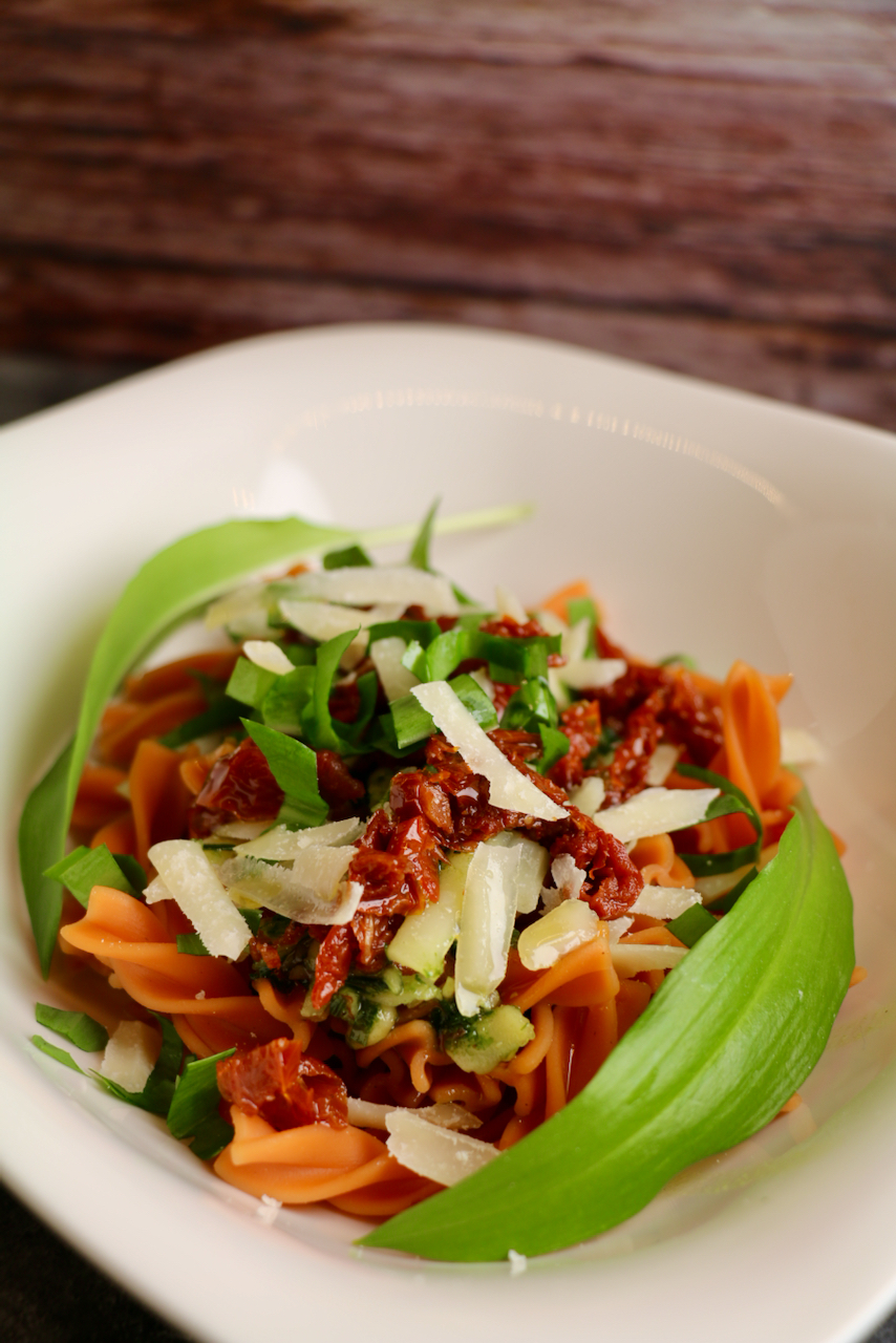 Aber heute gibt es Bärlauchpesto auf rote Linsen-Nudeln mit viel Parmesan und getrockneten Tomaten. Mjam!