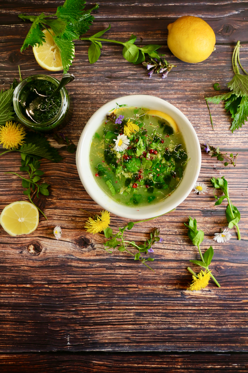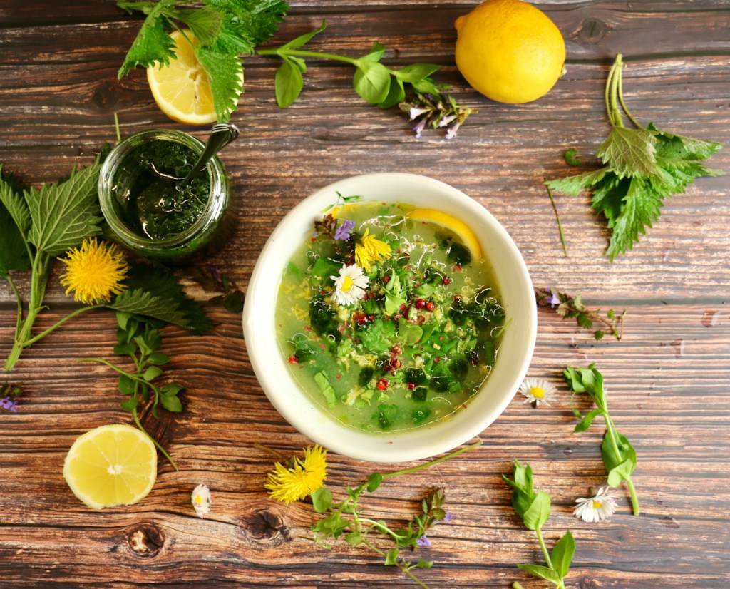 - Die Wildkräuter waschen, abtropfen lassen und fein schneiden. Kartoffeln und Zucchini klein schneiden und in der Suppe weich kochen.