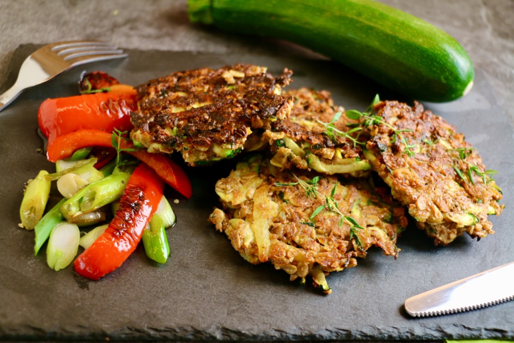 Zucchini-Laibchen mit Paprika-Gemüse