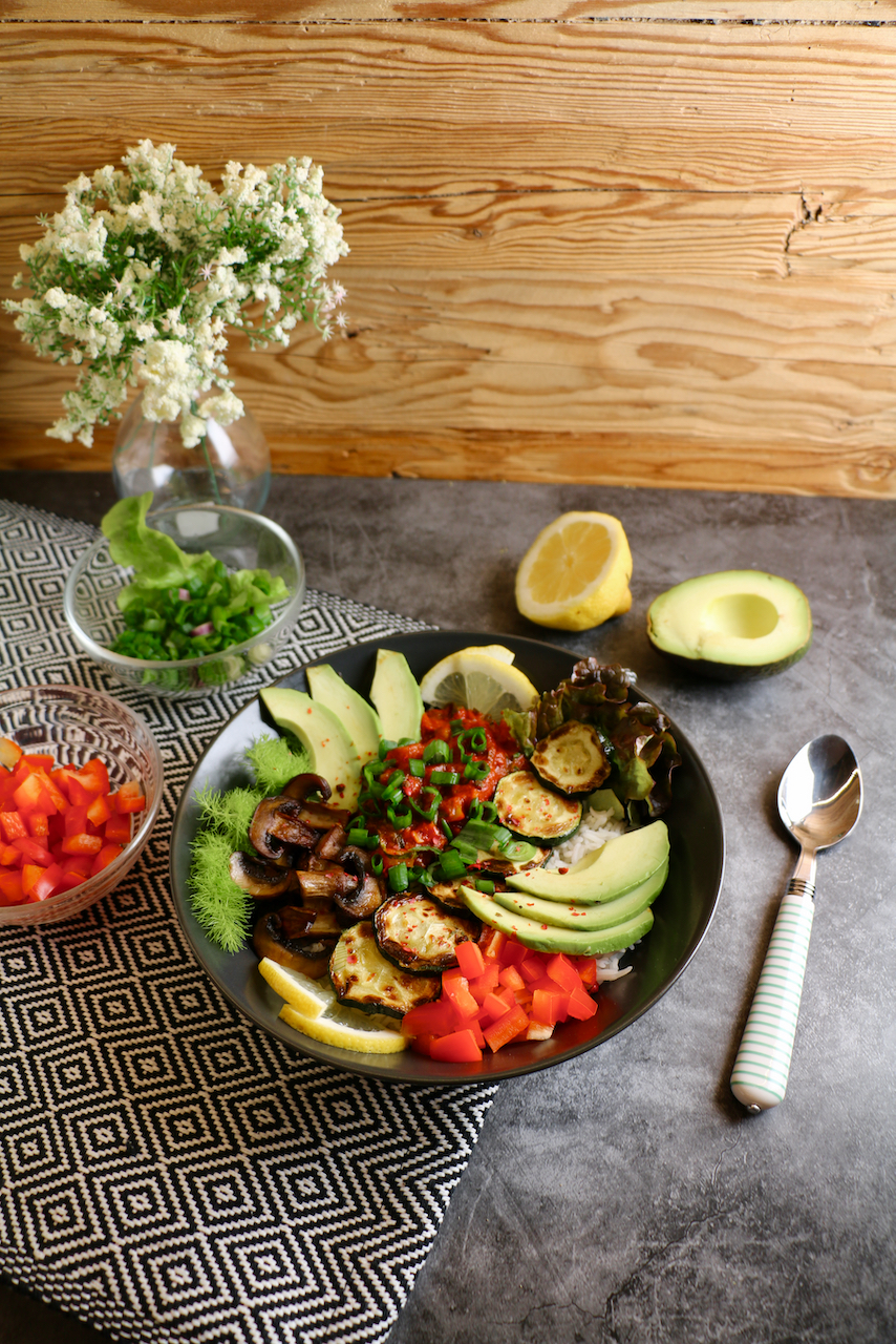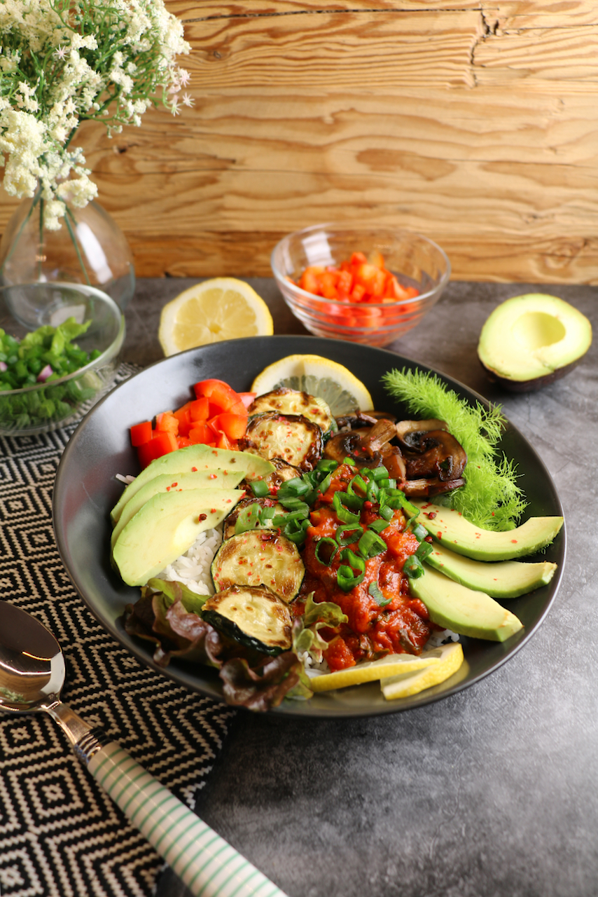 Heute gibt es vegane Bowl nach Thai-Art mit Zucchini, Kokosreis, Avocado und scharfer Tomaten-Sauce. Viel gesundes Gemüse, ein Teil roh, ein Teil gebraten, ein Teil in würziger Sauce, noch dazu hübsch angerichtet – wer kann da widerstehen?